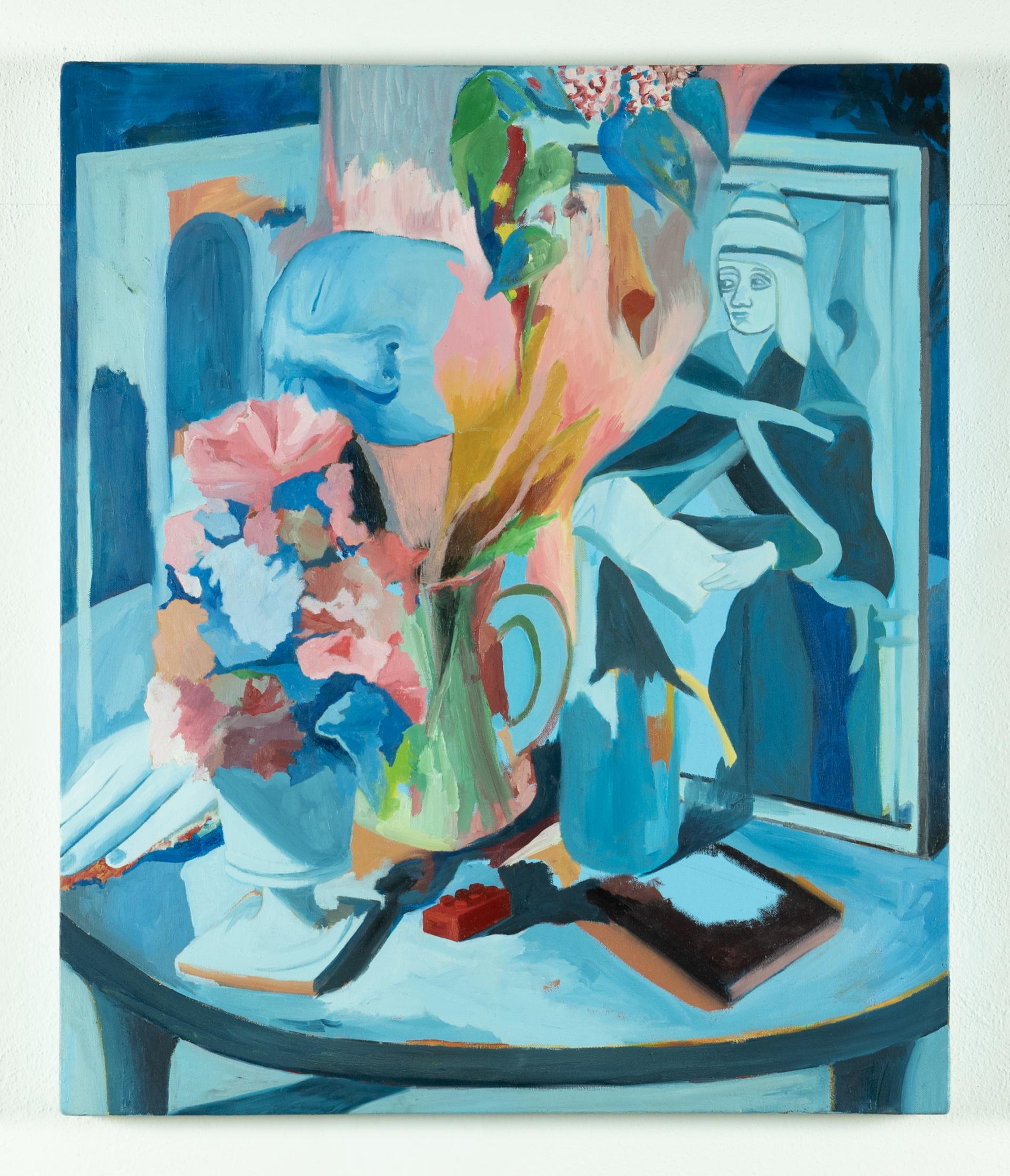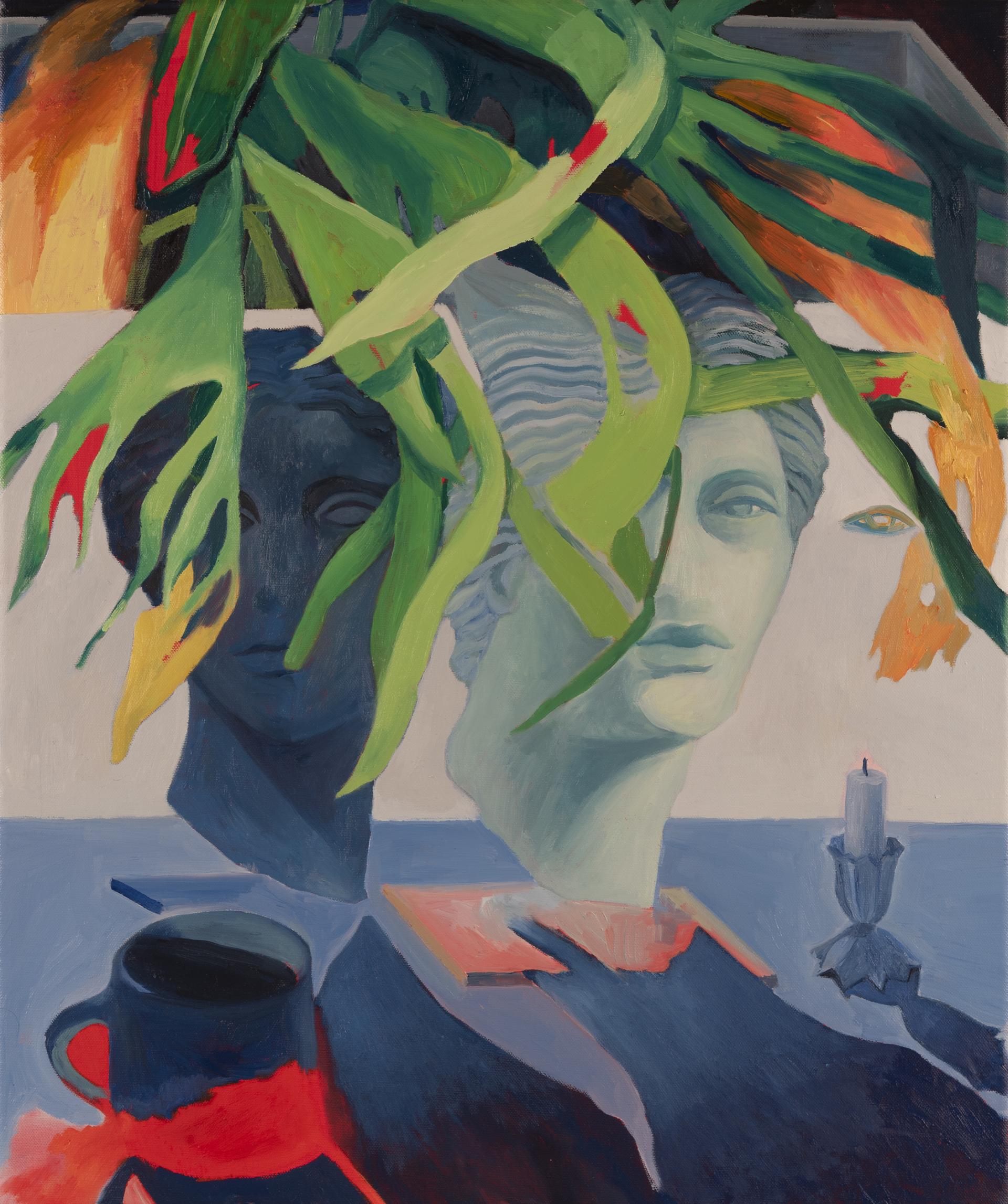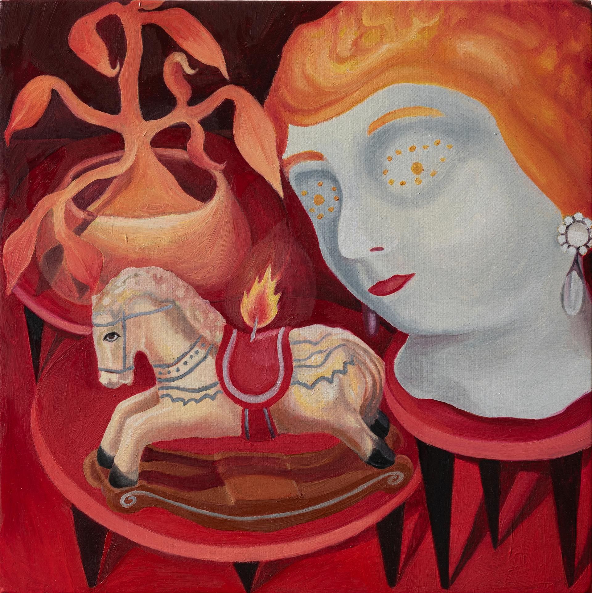 Her work creates a mysterious environment, rich with diverse cultures, through a poetic exploration centered on the life of everyday objects, thoughtfully arranged within the tradition of still life painting. Her pieces are distinguished by the presence of a platform on which childhood toys, plants, and common objects rest—a symbolic stage that, like a theatrical scene, elevates the ordinary and the prosaic to an extraordinary and enigmatic dimension. The dreamlike atmosphere is evoked through color and the unique juxtaposition of certain elements. These platforms frame and naturally reveal the artist’s inner world, suspended between dream and reality.