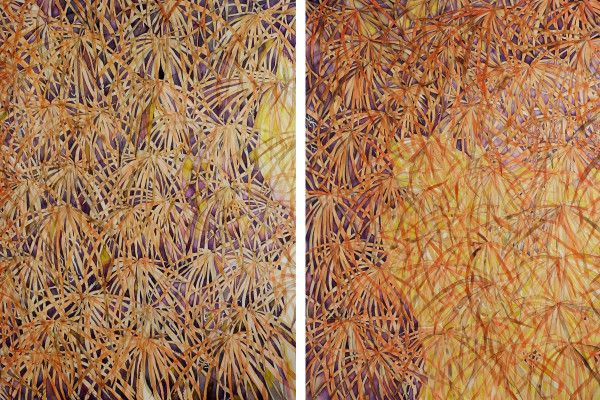 Cristiano Menchini's research arises from the physical comparison with the landscape, from direct contact and from the almost scientific study of vegetable microcosms. Moving in the gap between reality and fiction, Cristiano re-proposes symbolic universes, metaphors of a perceived world, dynamic surfaces independent of reality, not so much to reproduce a simple game of resemblances as to evoke other timeless spaces, that somewhere perhaps exist or have existed. The interest lies in the processes invisible to us that determine the development of the plant world, the organic and morphological part of nature that changes according to the climate, the wind and the light. Some of his works evoke calibrated plant ecosystems, others primitive scenarios made in real scale, still others, finally, through the repetition of a single plant element in the space of the canvas, direct the discourse towards formal abstraction.