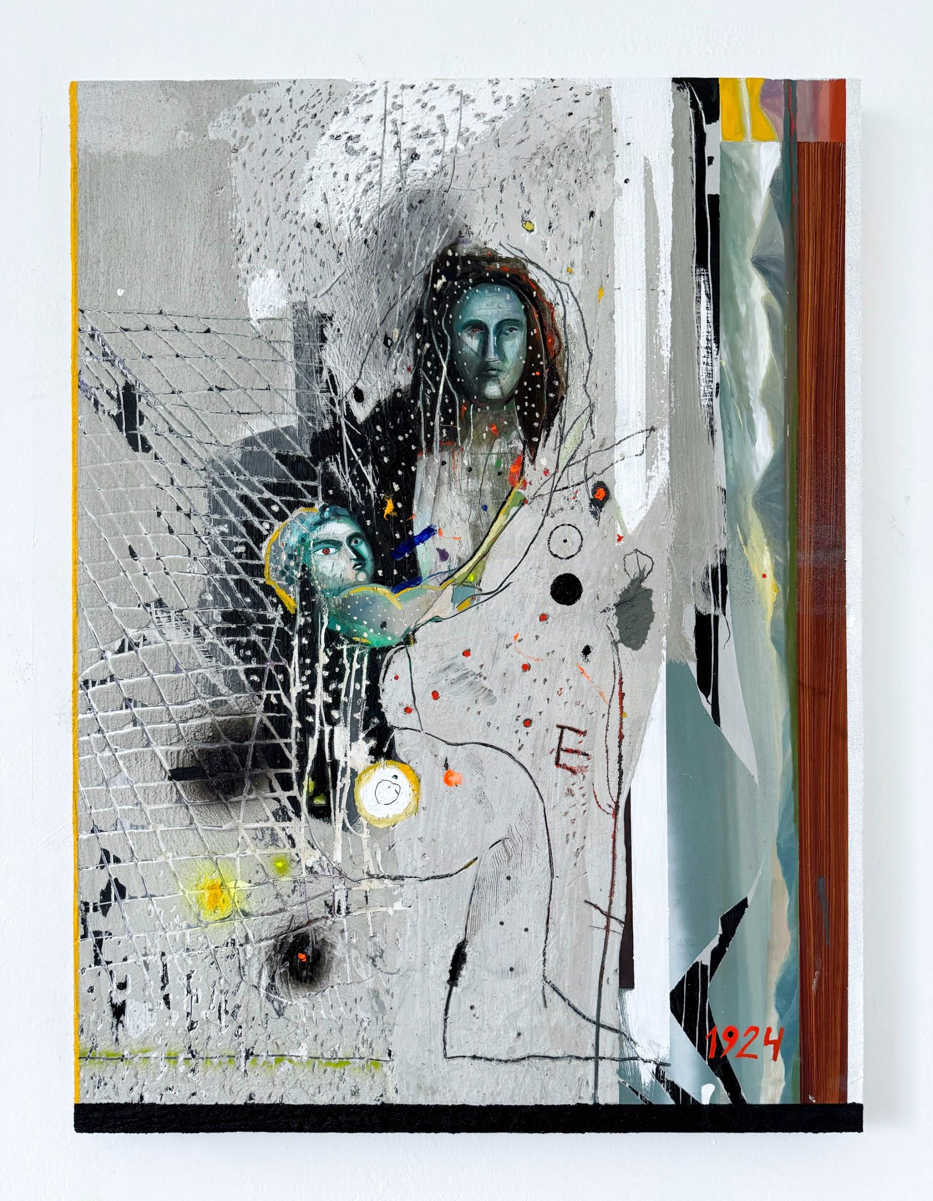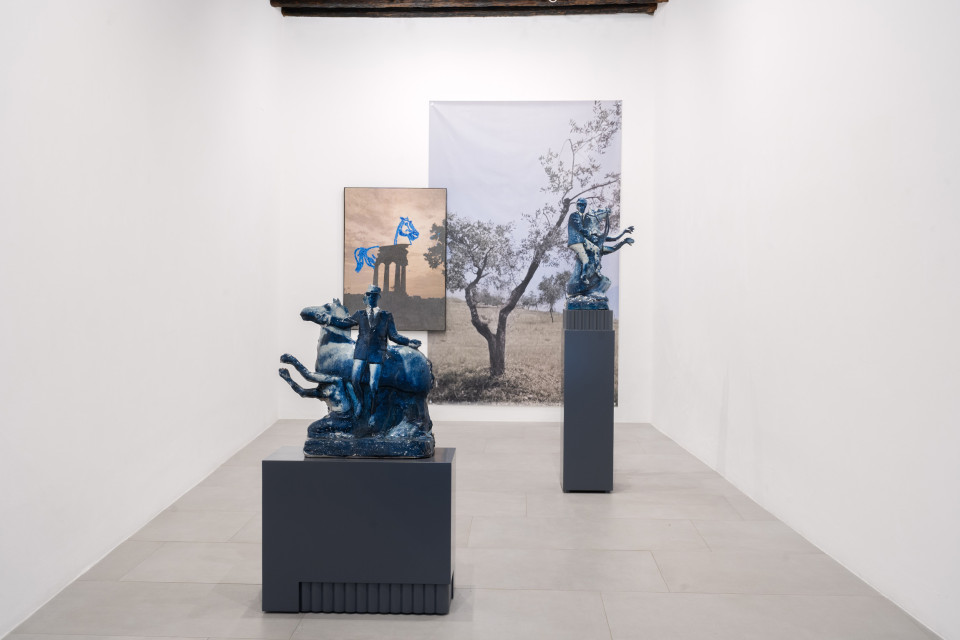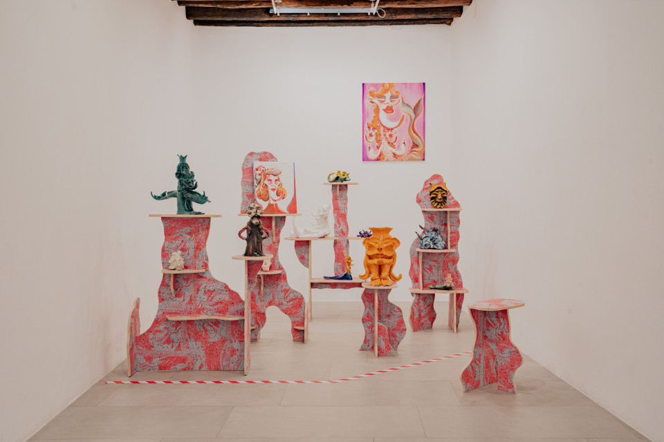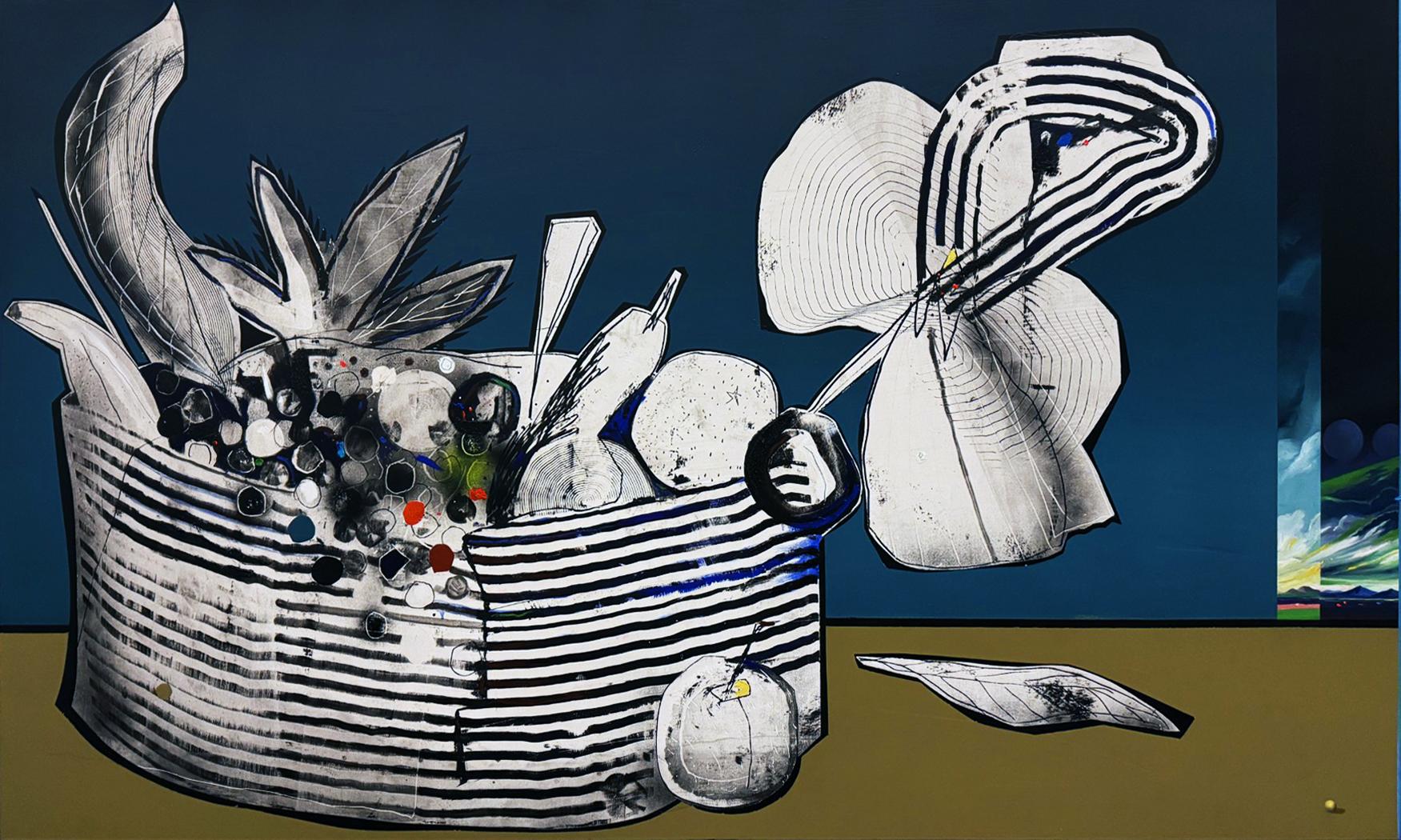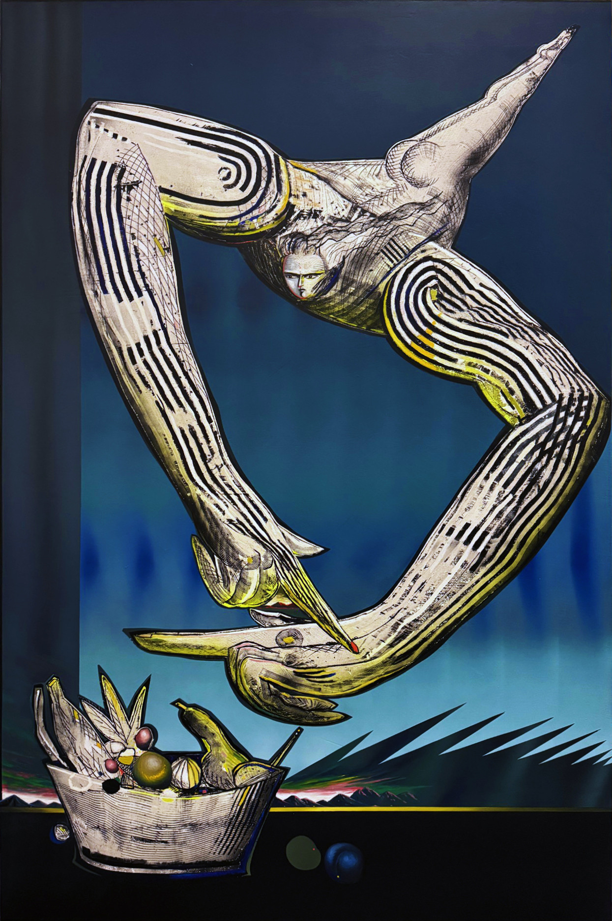 With a strong technical ability and richness of elements, Mattia Barbieri’s painting reveals a style where everything unfolds on a single plane, within which disparate and heterogeneous elements are often arranged without apparent hierarchy. The composition, solid and at times virtuosic, gathers sediments from the collective imagination, the history of art, and popular culture, recombined in a new form. The pictorial elements, whether belonging to tradition or more daring visual neologisms, are used as words that make up a grammatical code employed by the artist to interact with painting as a language, through which everything is deconstructed, restructured, and reinterpreted. The surface of the paintings is sometimes animated by signs and engravings, and a very delicate line marks the distinction between the pictorial and sculptural forms, which the artist often uses as an alternative mode of expression.
