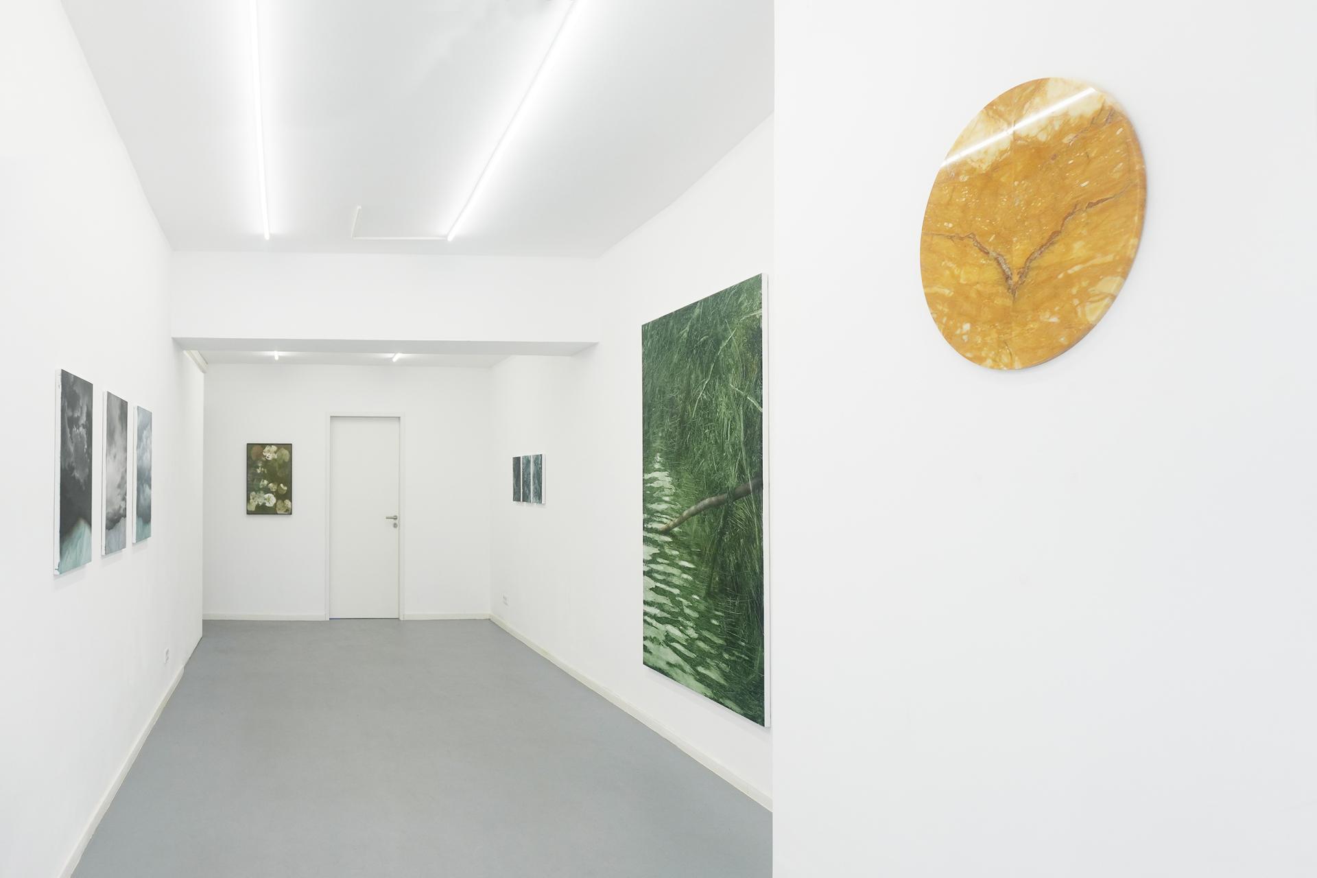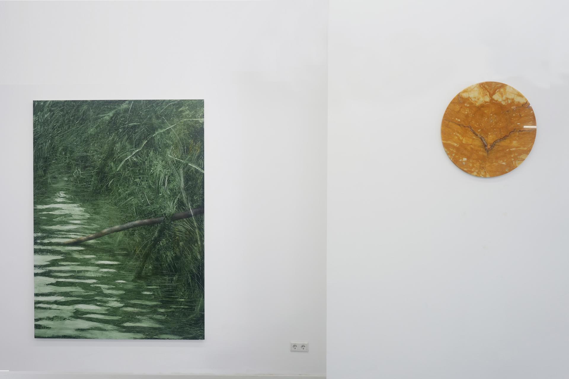 The works on display explore precisely this boundary between things—the depth hidden beneath appearances and the paint that settles on the real, transforming into an image that nearly touches abstraction. The compositions on view are landscapes created through contact and tension, unfolding at the threshold between elements. The negative and the positive intertwine, creating an adherence of surfaces that mold and adapt to one another, just as water conforms to the shape of the objects that contain it. Likewise, the sky, the field, the very matter: every substance of nature takes on the form that the other grants it. Painting, in the same way, adapts to this constant becoming.