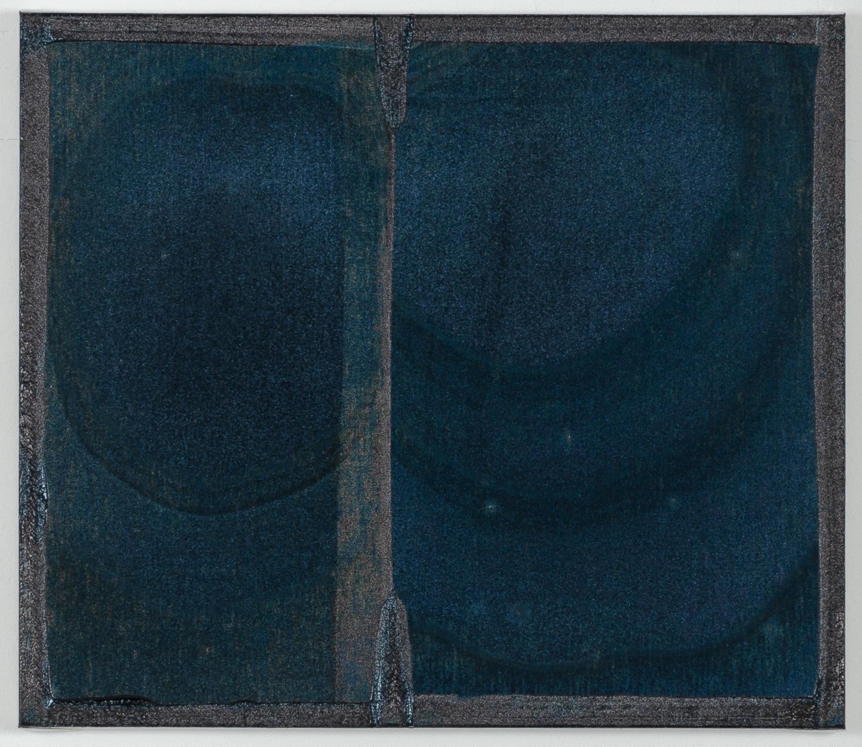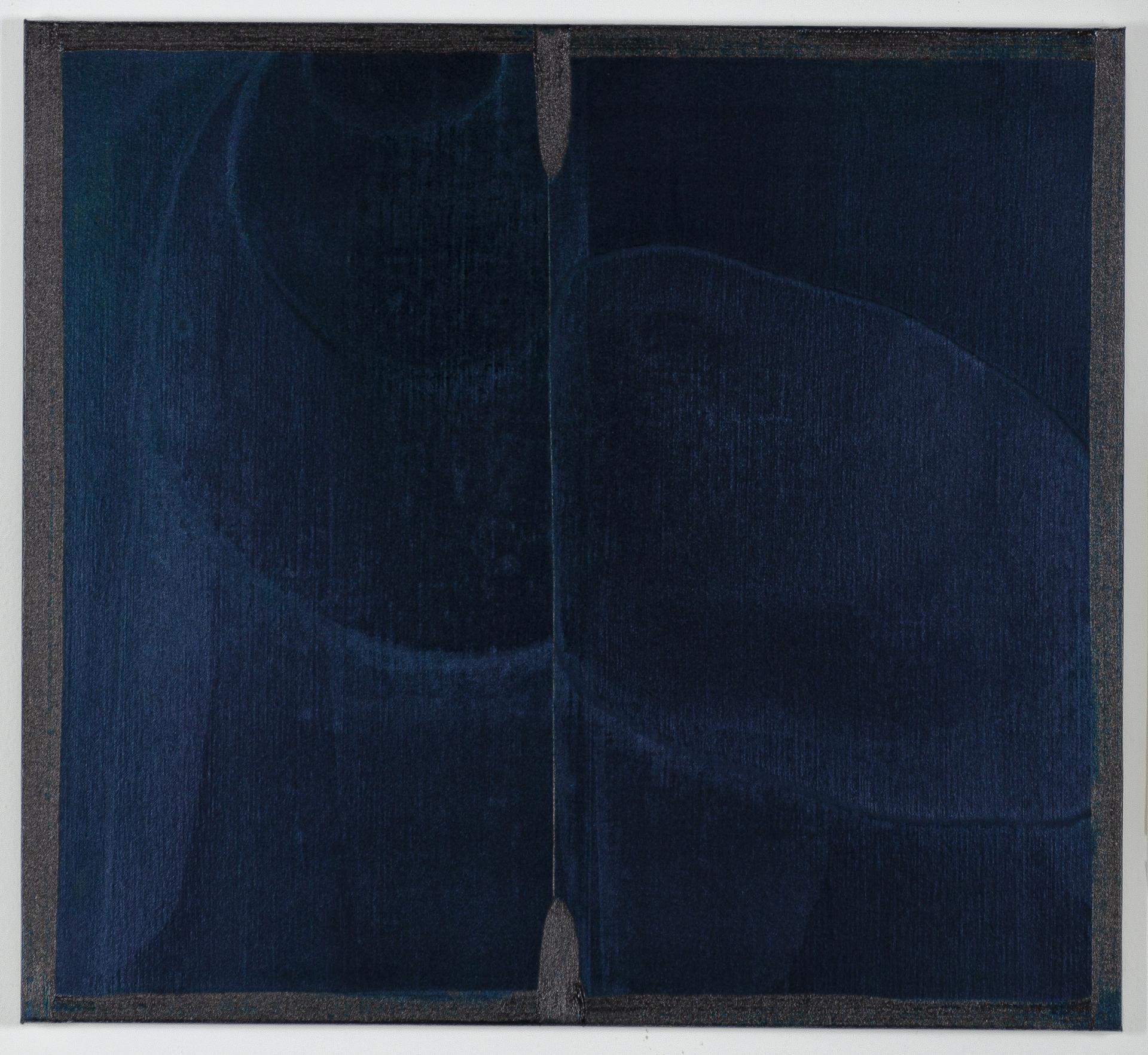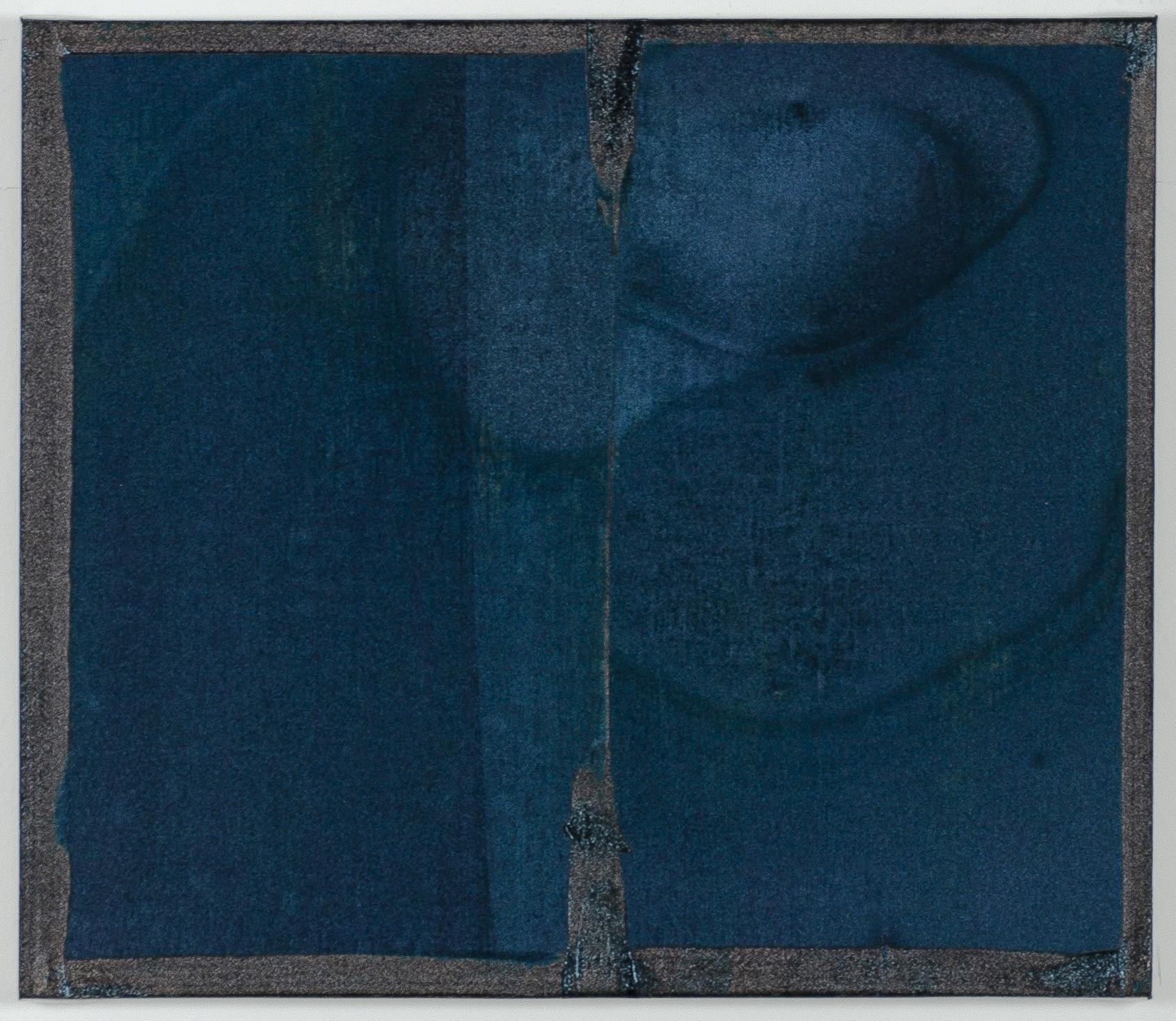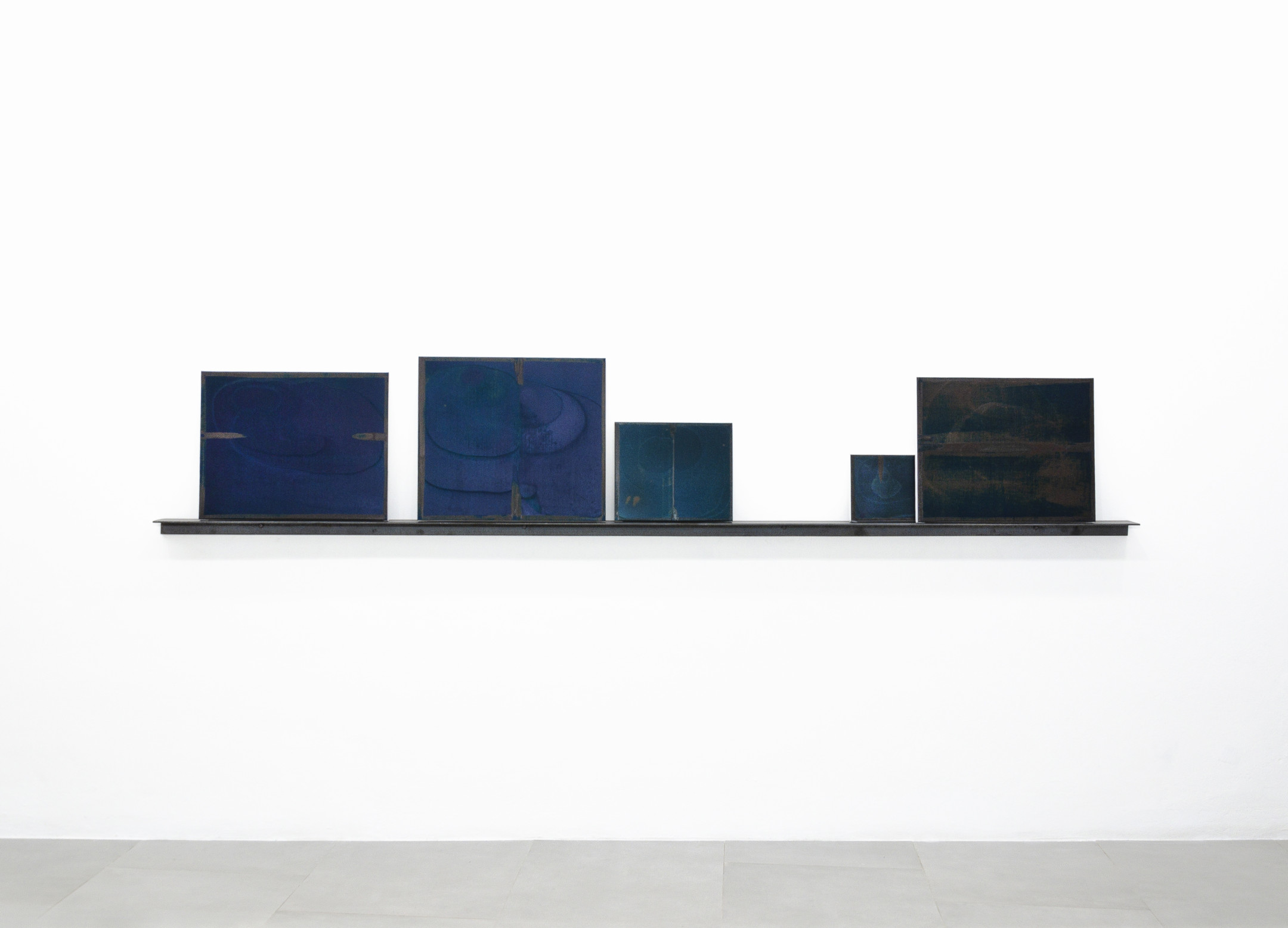 Prussian blue is a highly unstable pigment, destined for chromatic transformation and oxidisation. The chemical compound known as ferric ferrocyanide gives birth to an utterly distinctive blue, also known as Eisenblau (iron blue), which – when exposed to the action of sunlight and when in contact with canvases’ preparatory layers – deviates chromatically, assuming a mottled aspect and ultimately returning to its origins as a ferrous material, literally rusting. These artworks are born blue and, through an innate evolutionary process neither determined nor controlled by the artist, oxidise with time and partially ‘rust’, revealing a brownish-red colour in some or many areas of the painting. In the formal synthesis that animates these paintings, they establish and circumscribe themselves within the physical confinements, distilled and idealised, of the tableau format typical of European twentieth-century painting.