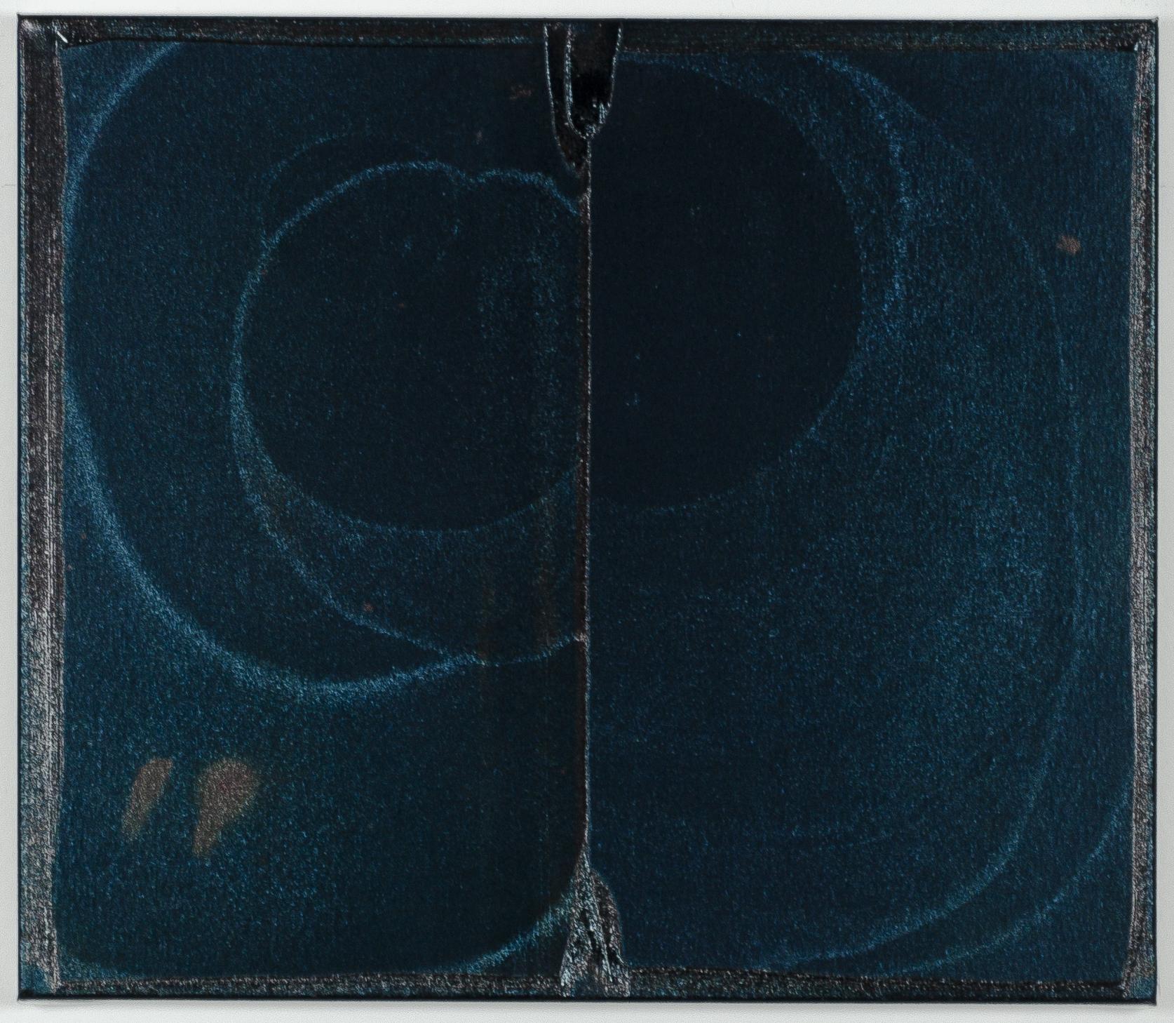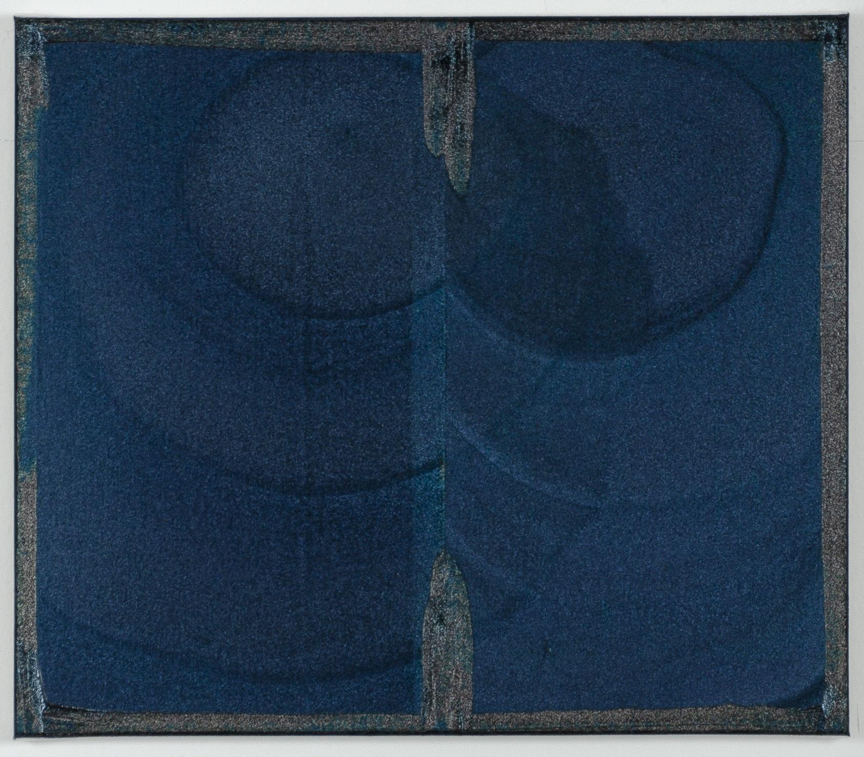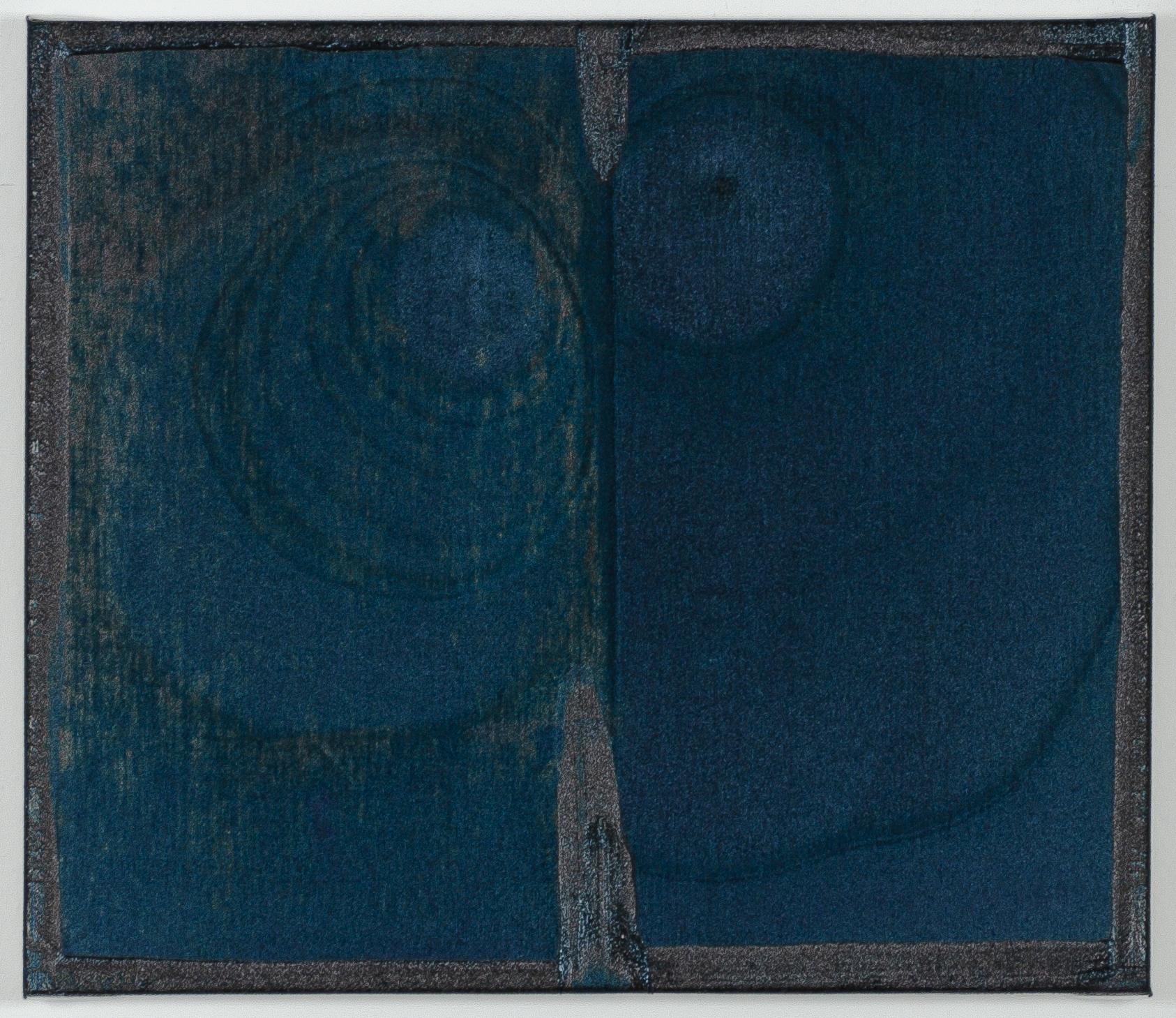 Prussian blue is a highly unstable pigment, destined for chromatic transformation and oxidisation. The chemical compound known as ferric ferrocyanide gives birth to an utterly distinctive blue, also known as Eisenblau (iron blue), which – when exposed to the action of sunlight and when in contact with canvases’ preparatory layers – deviates chromatically, assuming a mottled aspect and ultimately returning to its origins as a ferrous material, literally rusting. These artworks are born blue and, through an innate evolutionary process neither determined nor controlled by the artist, oxidise with time and partially ‘rust’, revealing a brownish-red colour in some or many areas of the painting. In the formal synthesis that animates these paintings, they establish and circumscribe themselves within the physical confinements, distilled and idealised, of the tableau format typical of European twentieth-century painting.