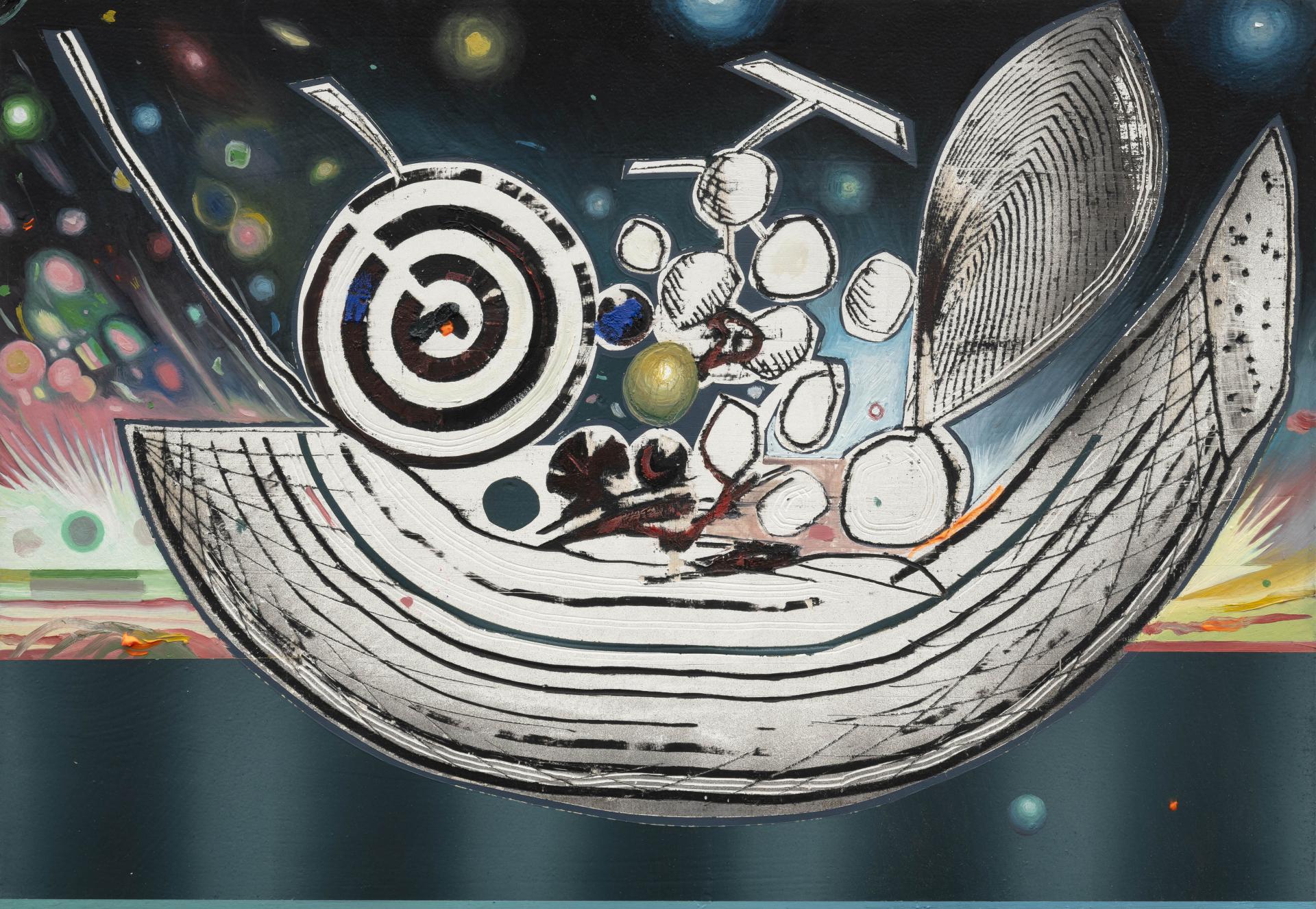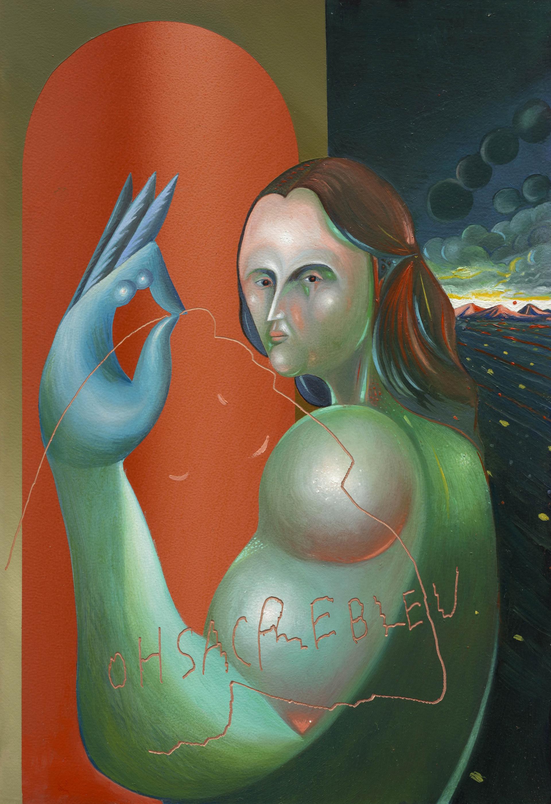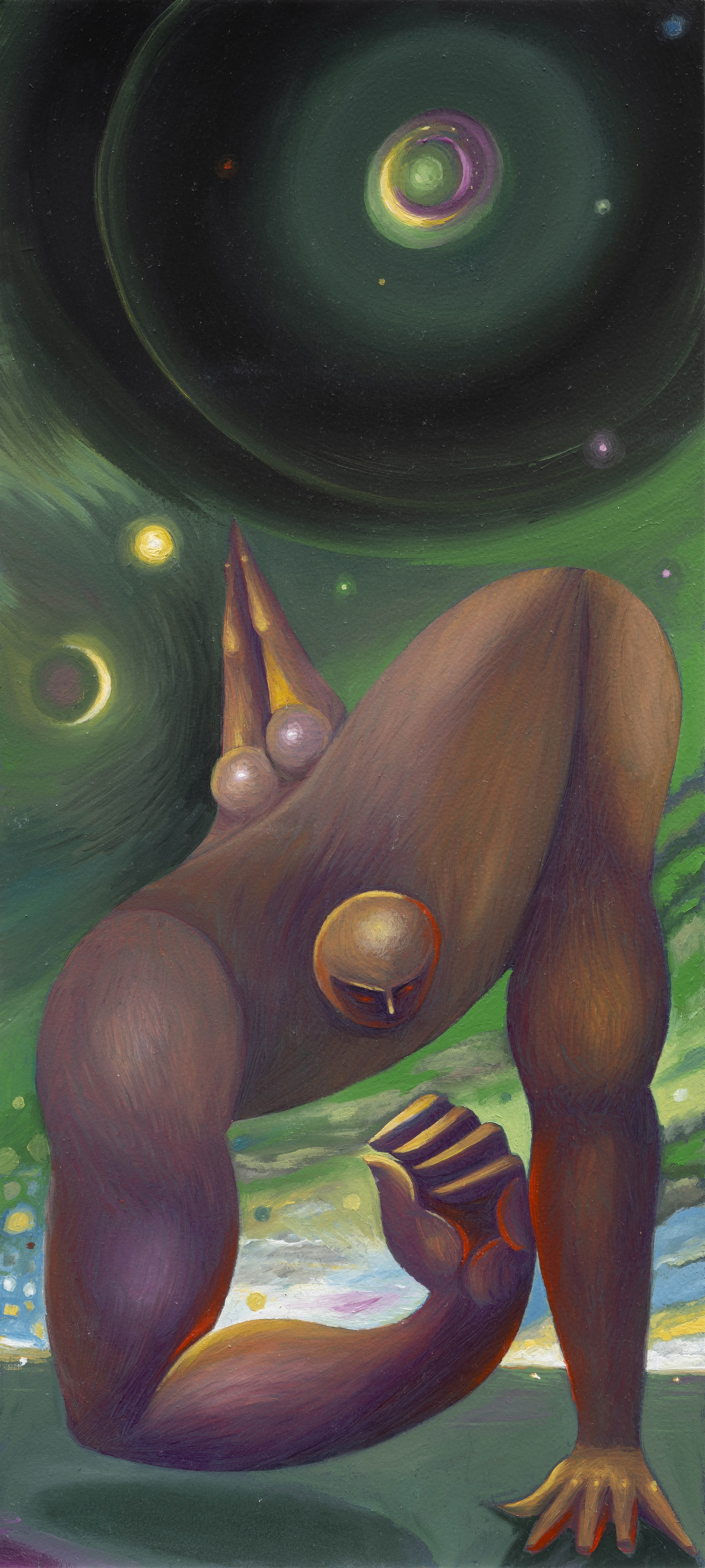 In BLUMEN DE LUMINE, human figures – massive and powerful – appear like divine giants, oscillating between heaven and earth. Spatial dimension and circular movement are recurring dynamics that expand visual perception, as if each painting were a nucleus from which new energy radiates. In this context, the copper support plays a crucial role: beyond serving as a conductor, copper becomes a magical surface, a channel through which the emanations of the subjects flow toward the viewer, endowing the painted forms with power.