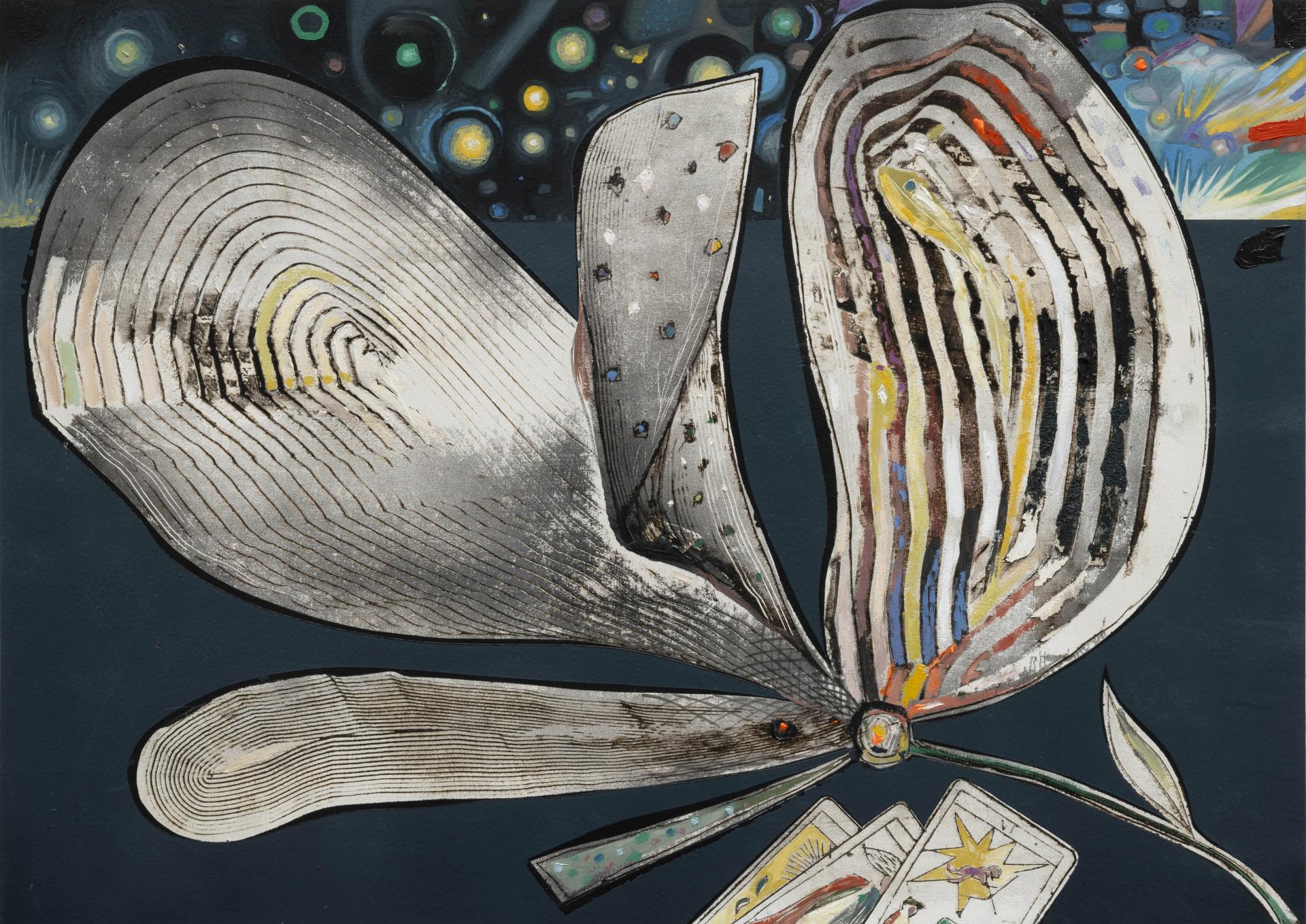 In his works, Barbieri weaves together cultural and spiritual references, citing the famous alchemical treatise Lumen de Lumine (light of light), which alludes to the supreme creator and to light as the origin of all existence. The exhibition becomes a space where the flower, a symbol of beauty and fragility, is transformed into a powerful vehicle of cosmic energy. Pulsating forms and colorful stars burst forth like multiplying gleams, while the flowers, with their central stamens, radiate like small expanding galaxies.