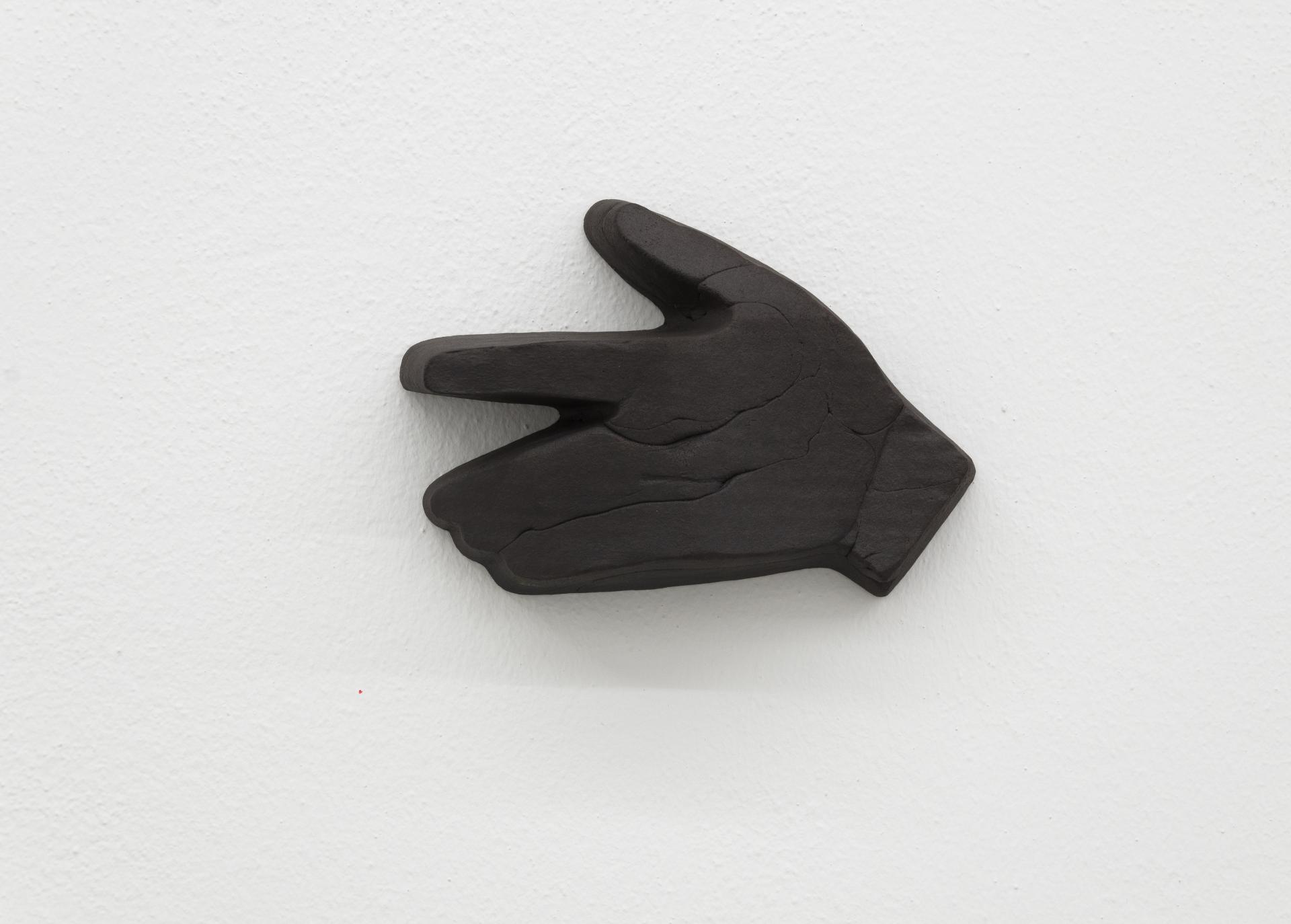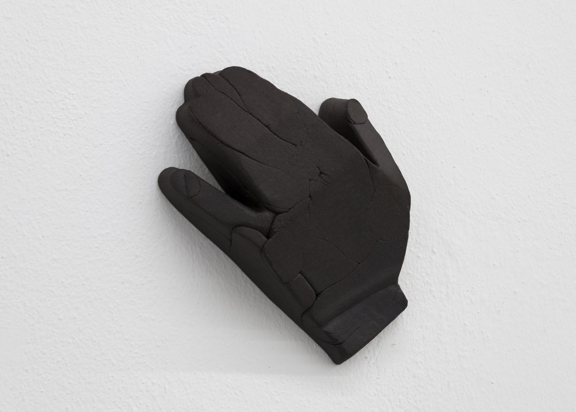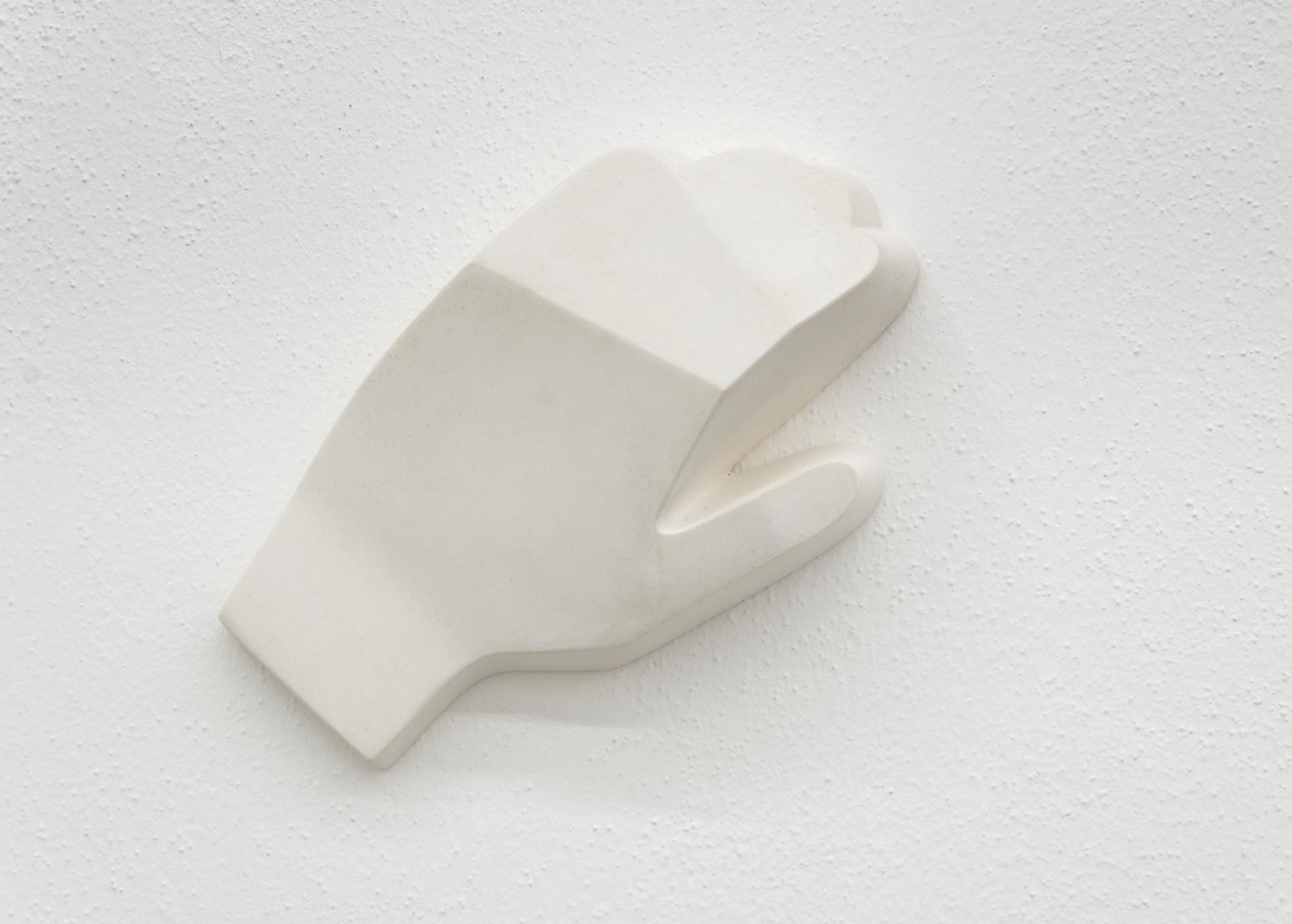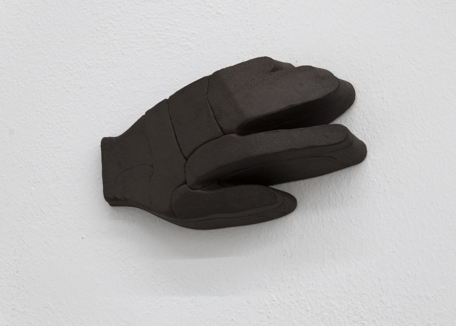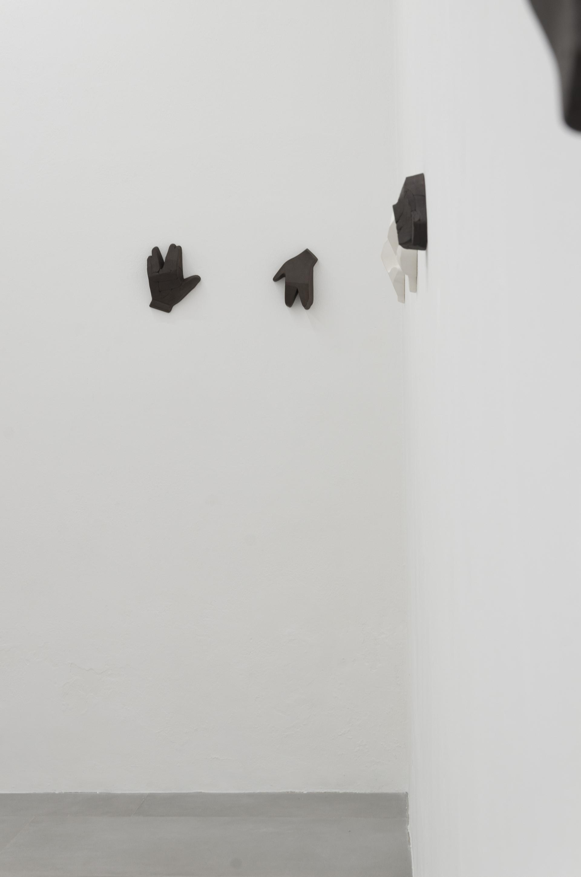The small sculptures exhibited here are created by a process of transposition and "materialization" of a silhouette drawing, previously obtained by tracing the profile of a real hand on a cartboard; the first one was the left hand of the artist himself, and then of many others, among friends, colleagues and acquaintances. The cardboard, cut out and folded according to the drawn outline, is then filled with an excessive volume of material that not exactely takes into account the natural hand/model but, almost in opposition, it self-represents and self-exalts as autonomous Volume, rising to rank of "subject" itself. The classic process of calque or casting molds gives volume and texture to the finished shape, that now appears smooth and white, now corrugated and black.
