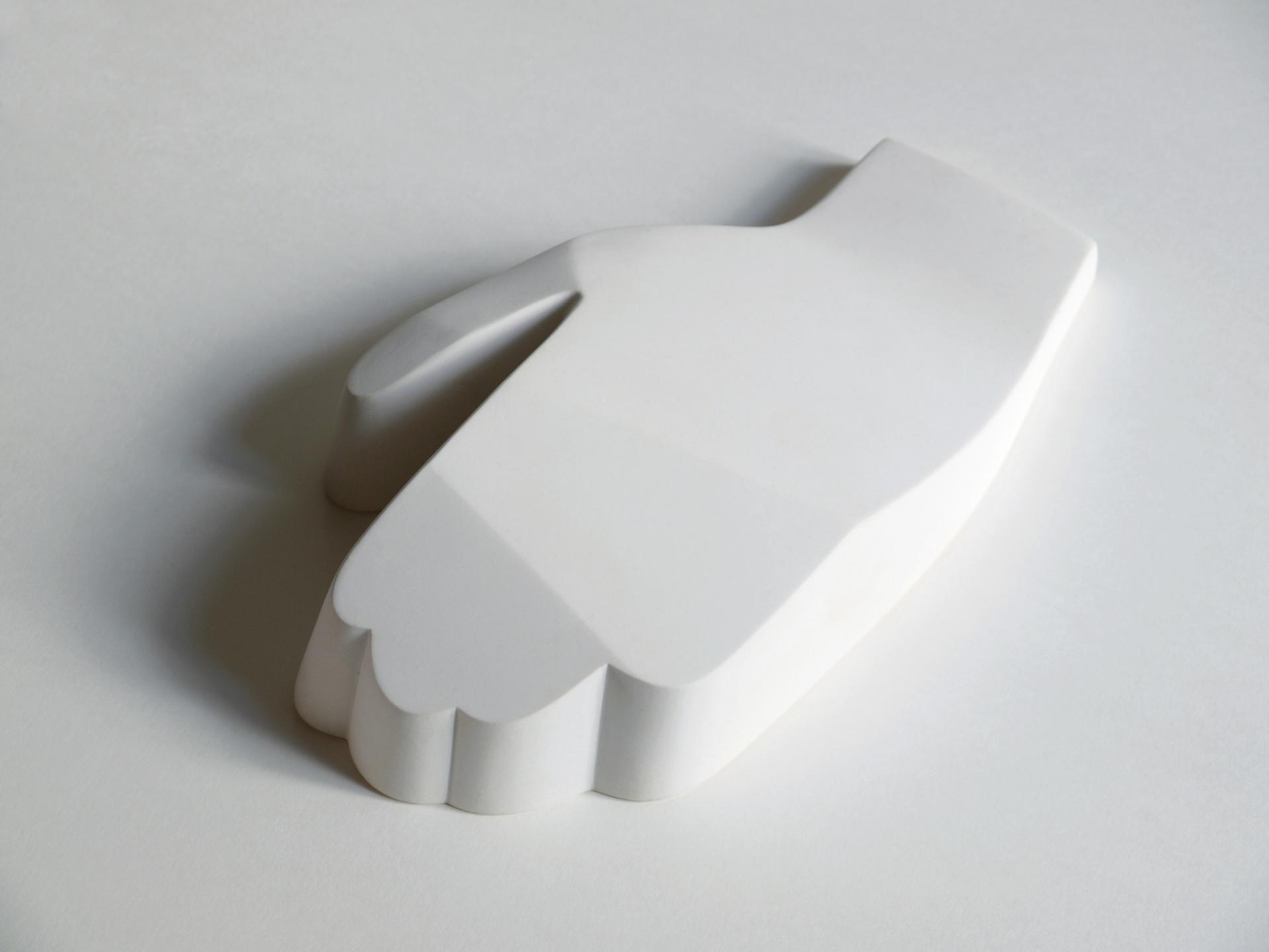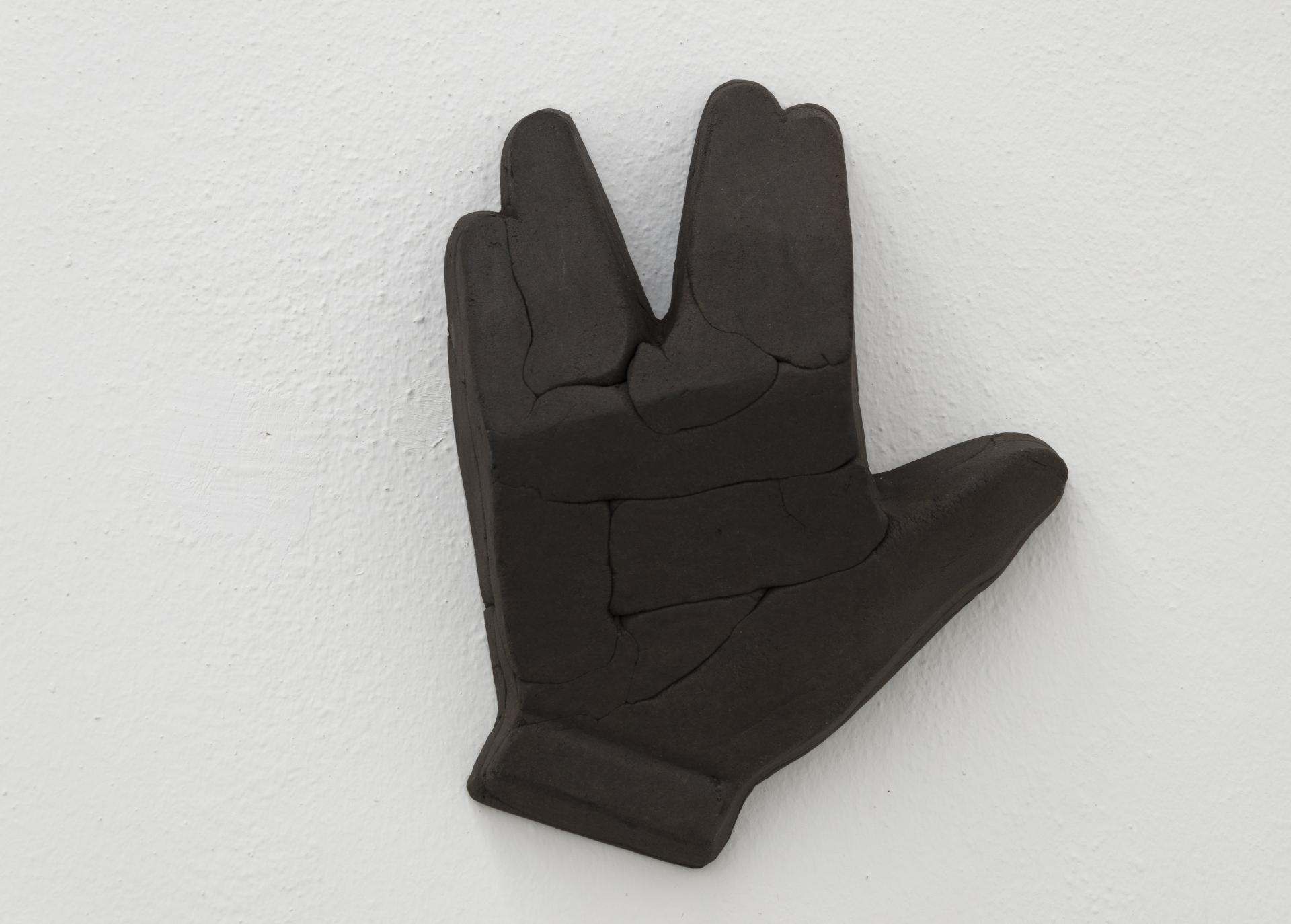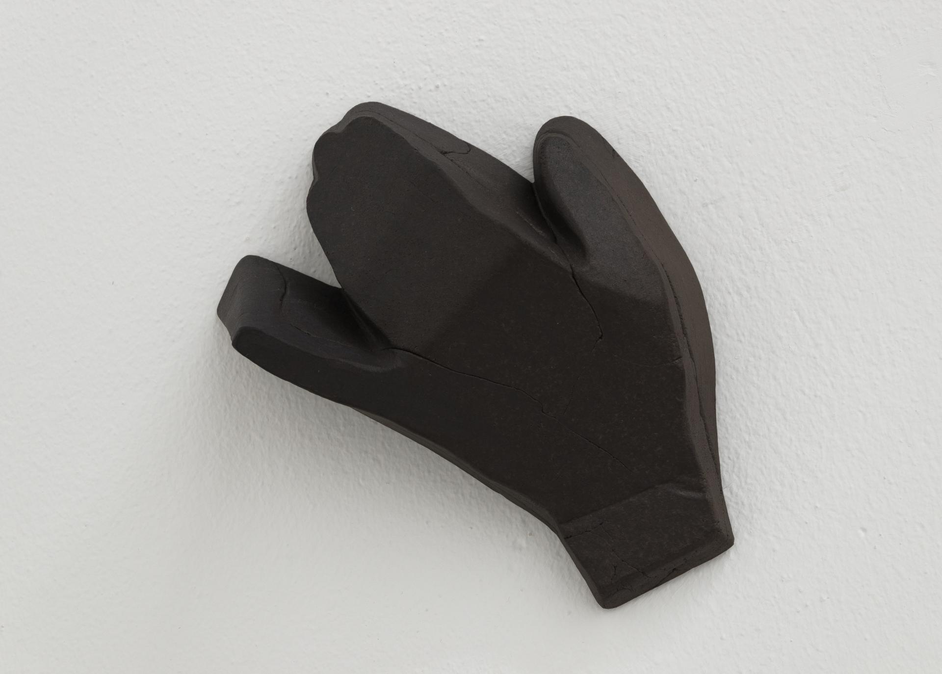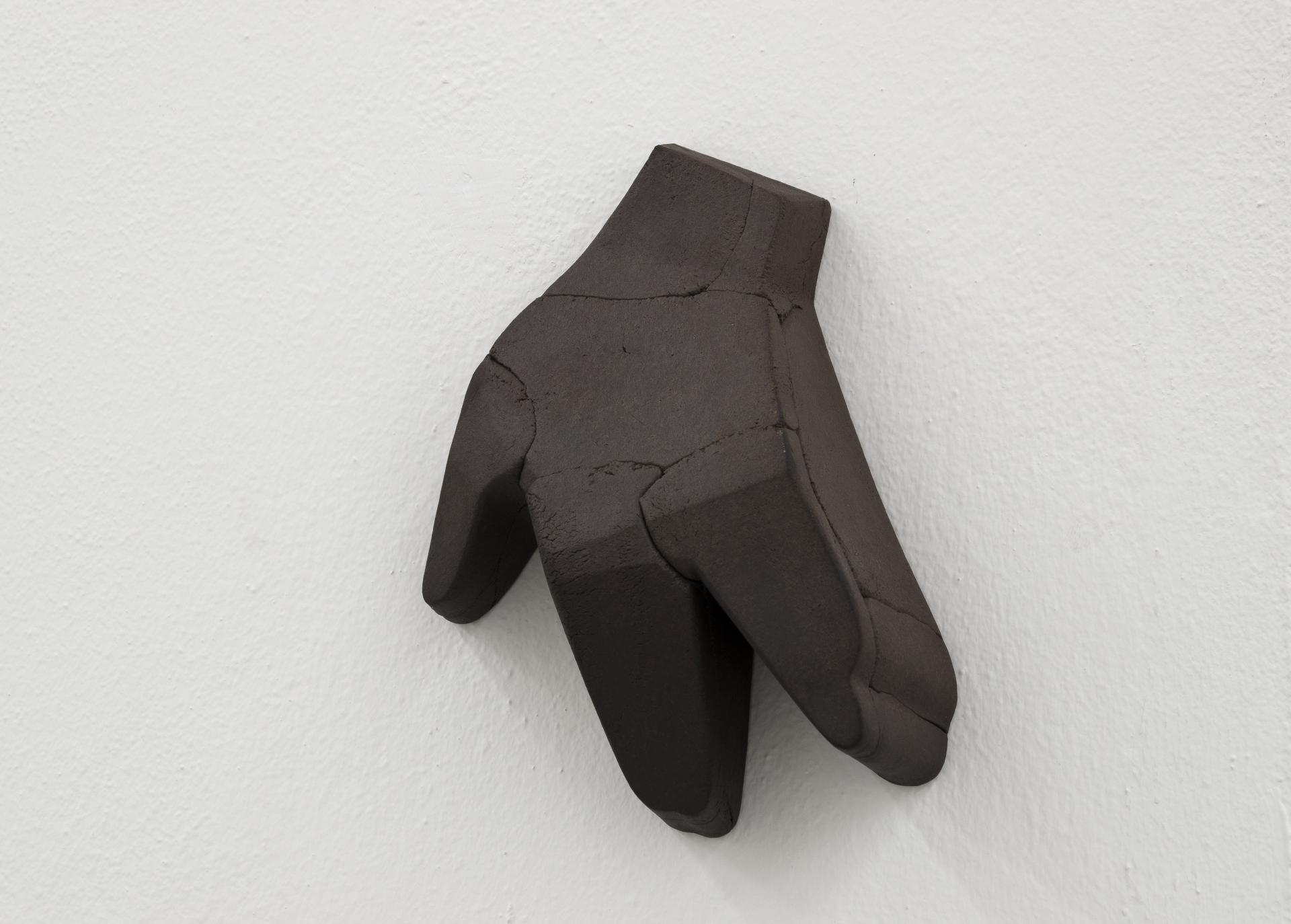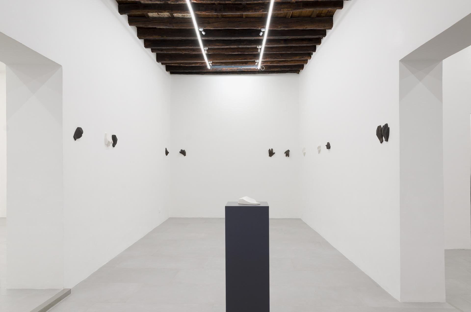 The small sculptures exhibited here are created by a process of transposition and "materialization" of a silhouette drawing, previously obtained by tracing the profile of a real hand on a cartboard; the first one was the left hand of the artist himself, and then of many others, among friends, colleagues and acquaintances. The cardboard, cut out and folded according to the drawn outline, is then filled with an excessive volume of material that not exactely takes into account the natural hand/model but, almost in opposition, it self-represents and self-exalts as autonomous Volume, rising to rank of "subject" itself. The classic process of calque or casting molds gives volume and texture to the finished shape, that now appears smooth and white, now corrugated and black.