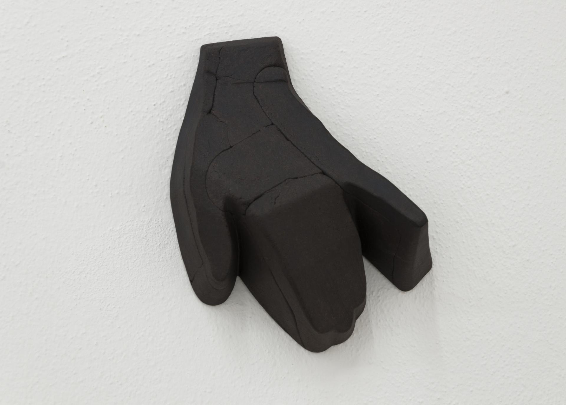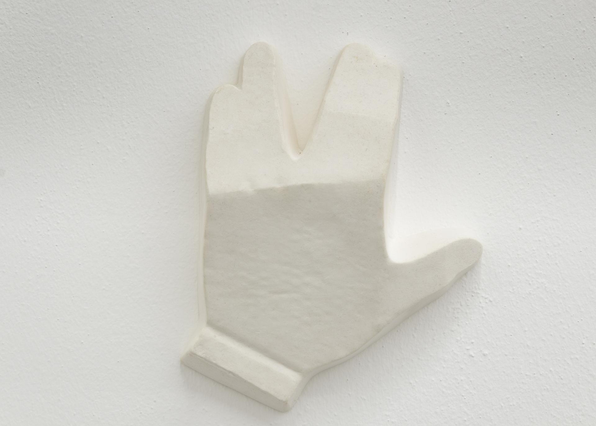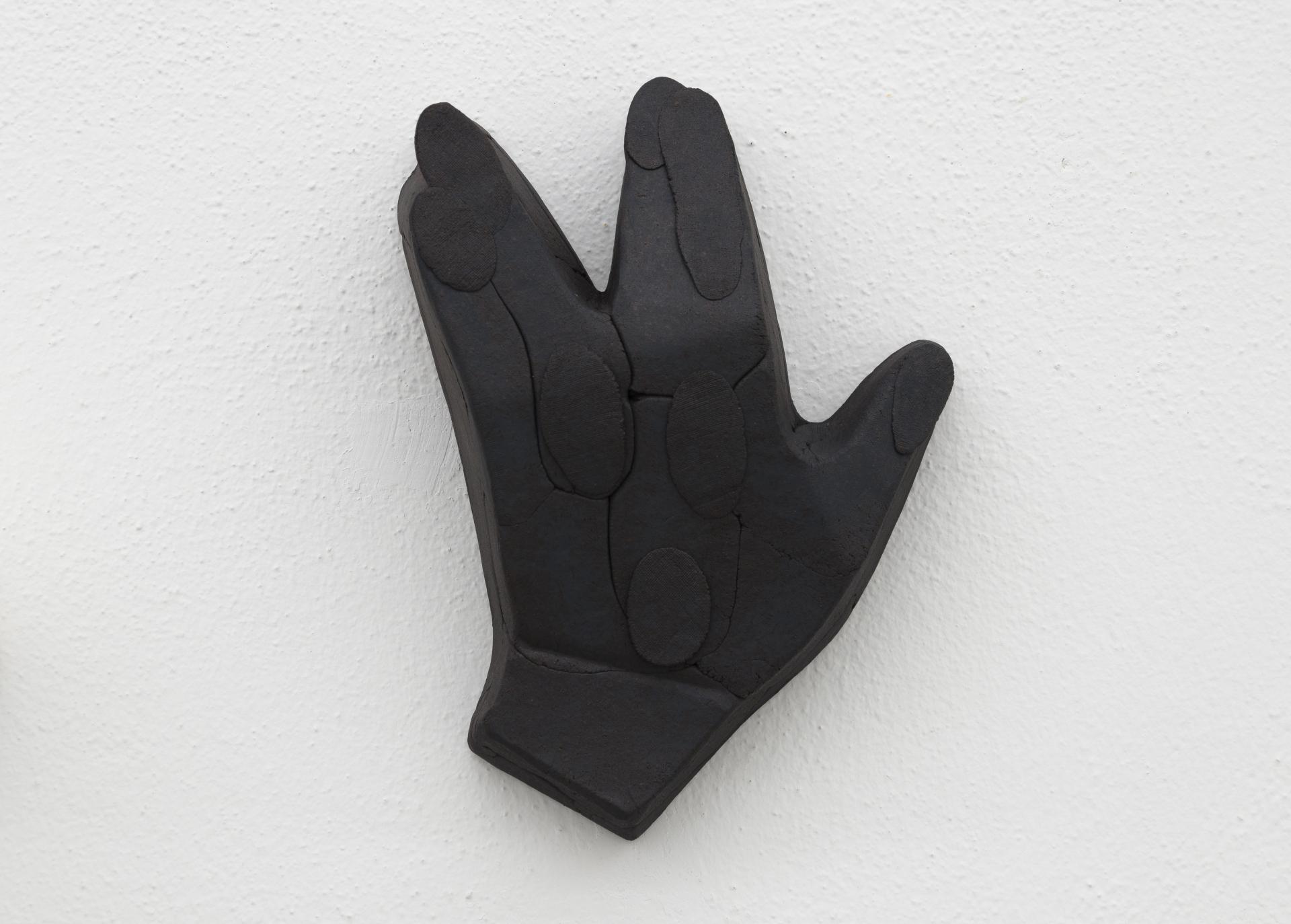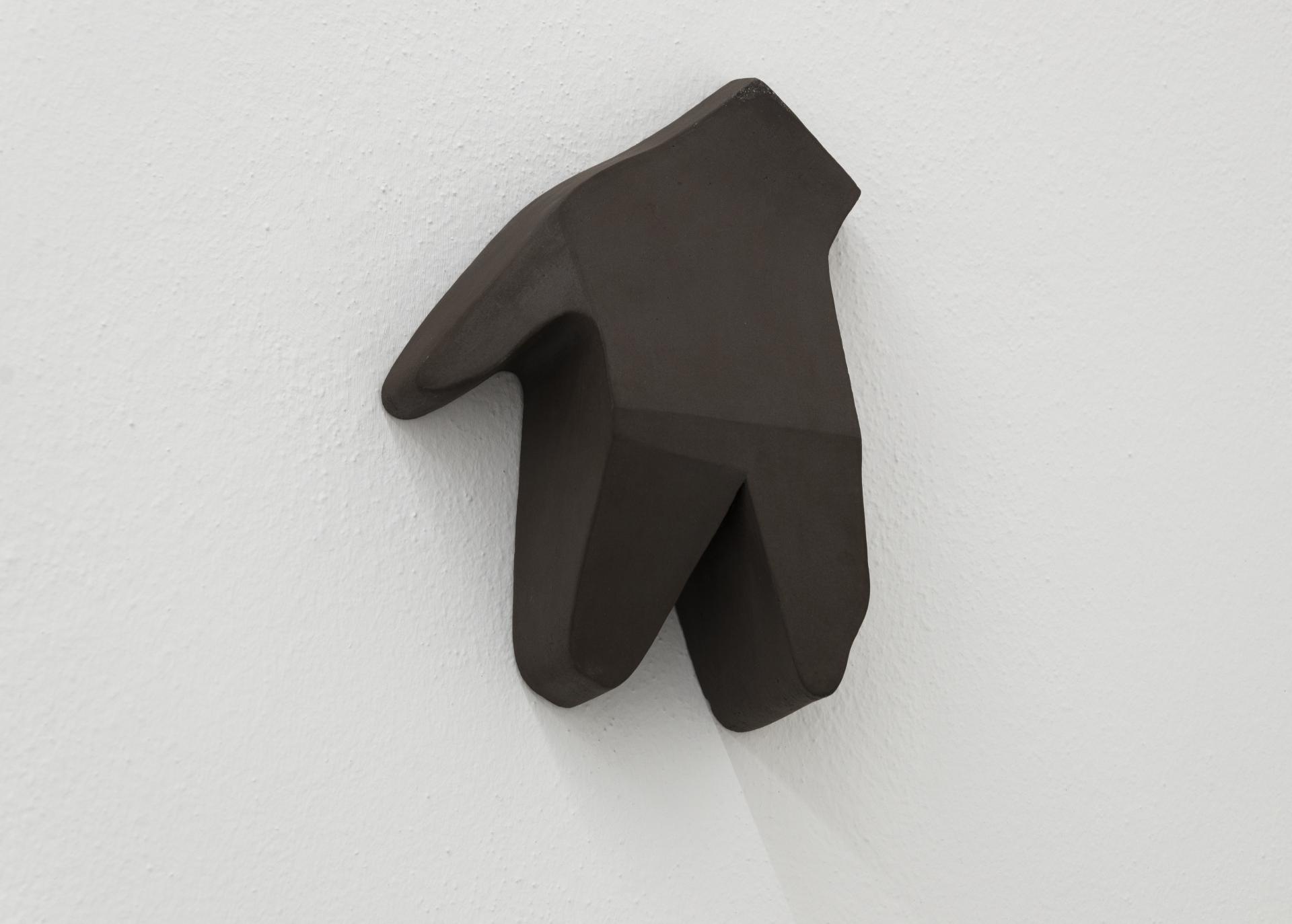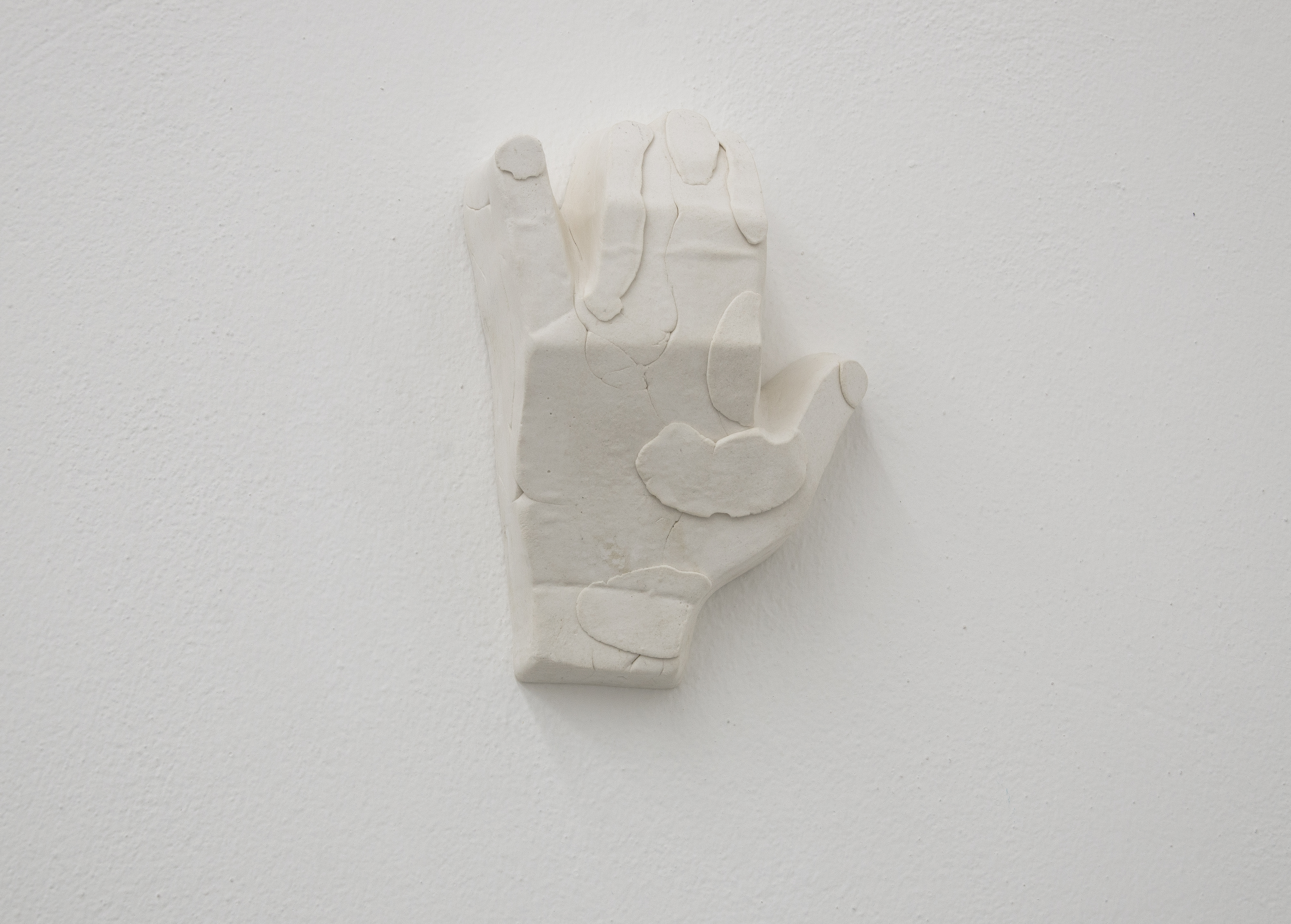 The small sculptures exhibited here are created by a process of transposition and "materialization" of a silhouette drawing, previously obtained by tracing the profile of a real hand on a cartboard; the first one was the left hand of the artist himself, and then of many others, among friends, colleagues and acquaintances. The cardboard, cut out and folded according to the drawn outline, is then filled with an excessive volume of material that not exactely takes into account the natural hand/model but, almost in opposition, it self-represents and self-exalts as autonomous Volume, rising to rank of "subject" itself. The classic process of calque or casting molds gives volume and texture to the finished shape, that now appears smooth and white, now corrugated and black.