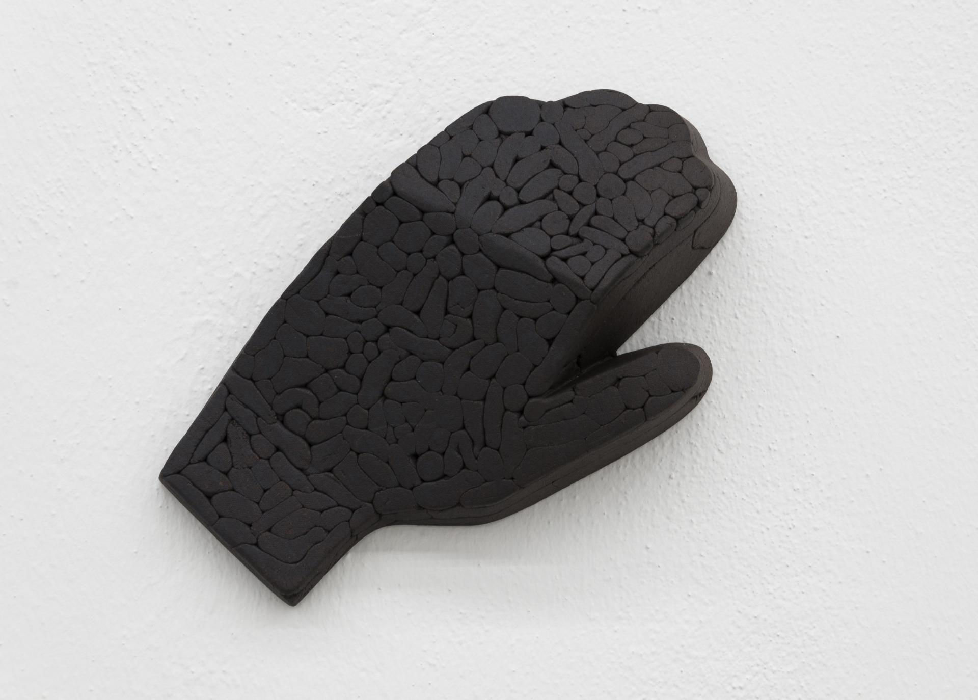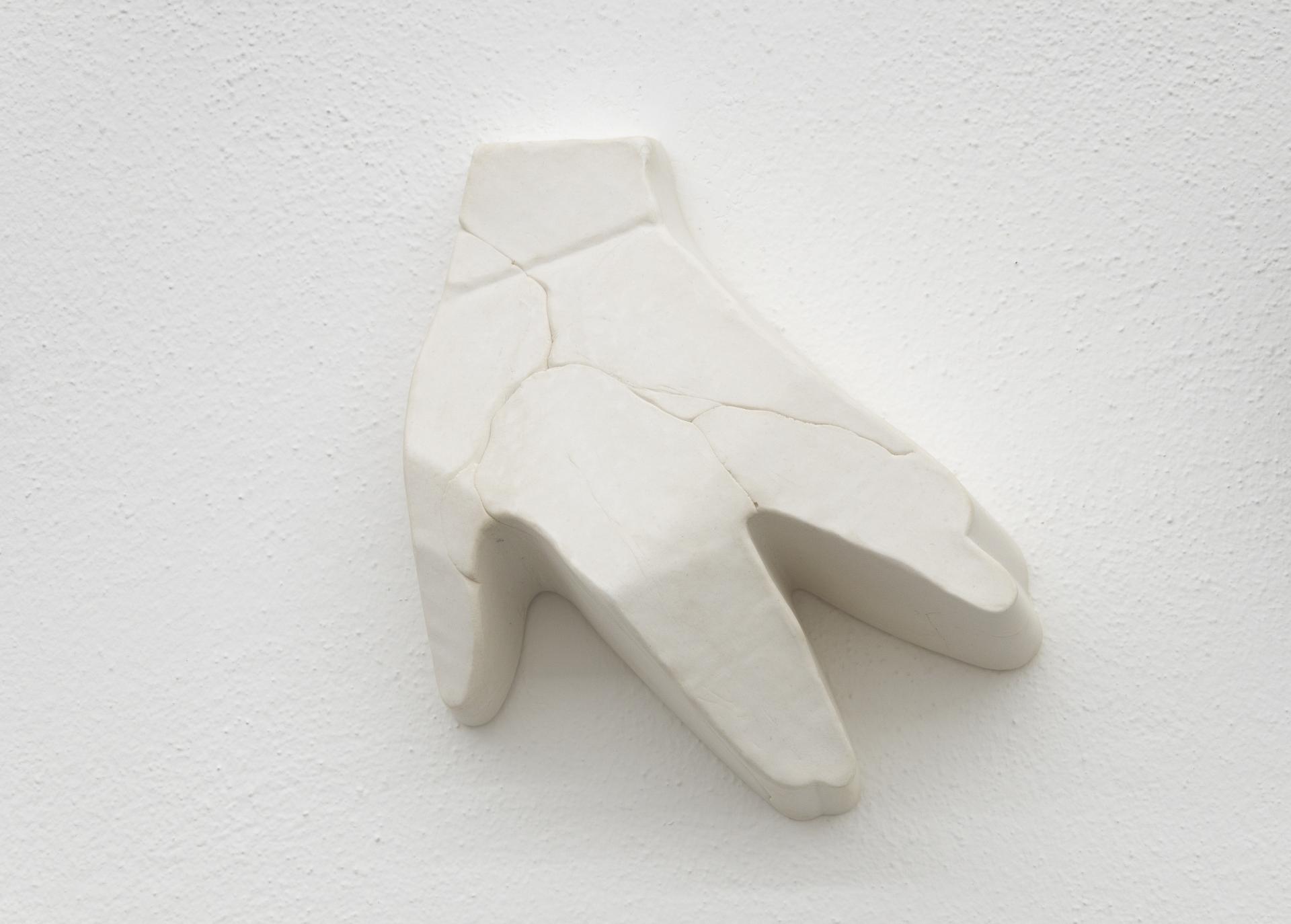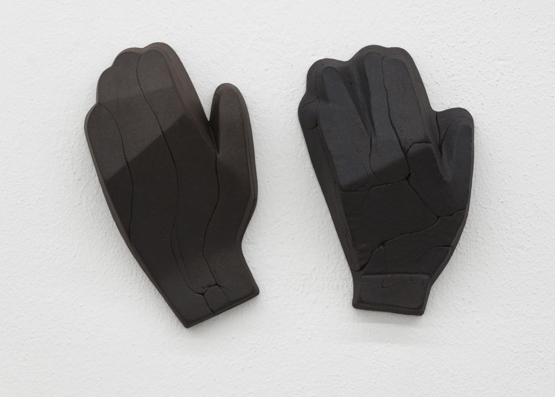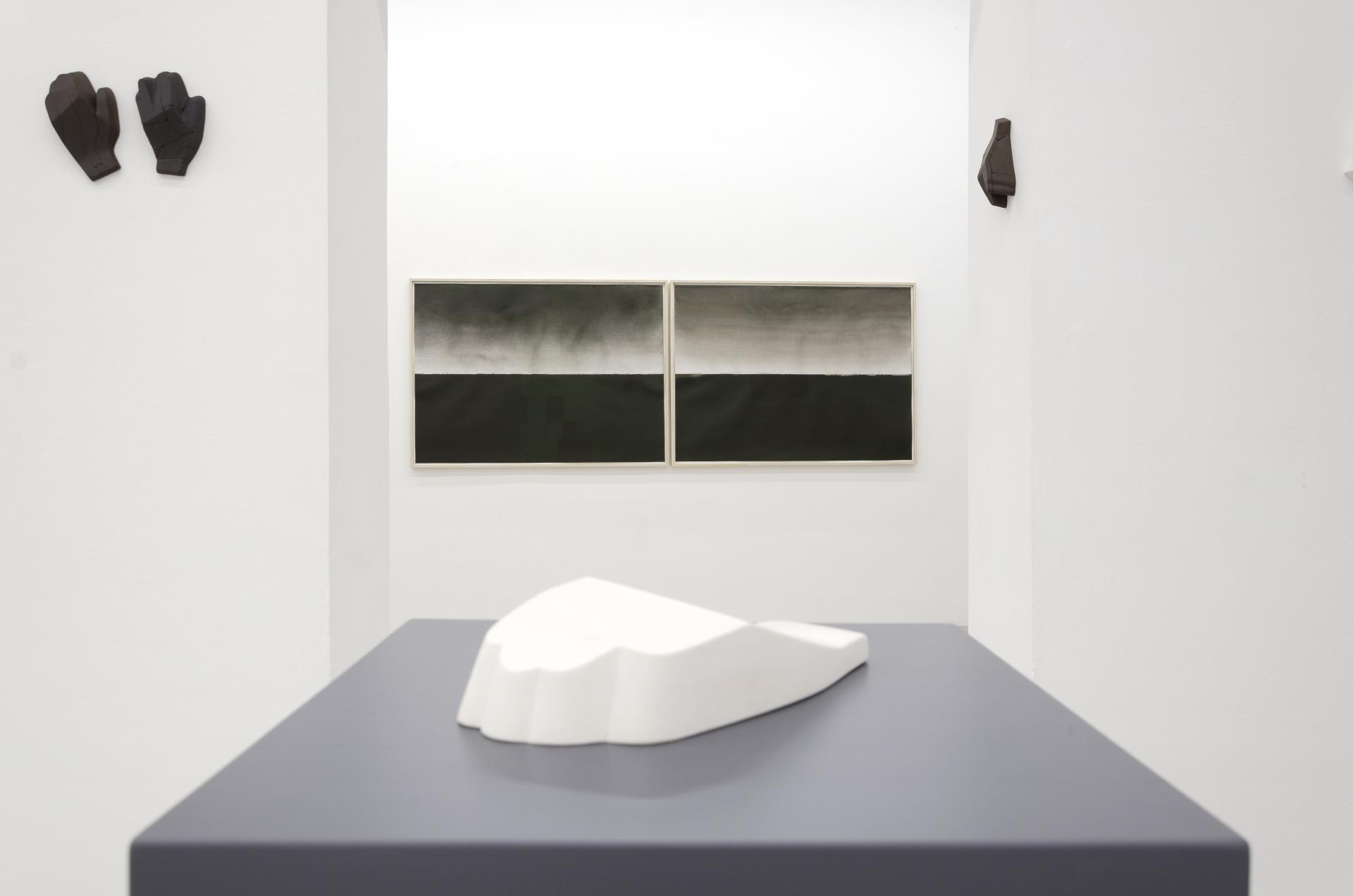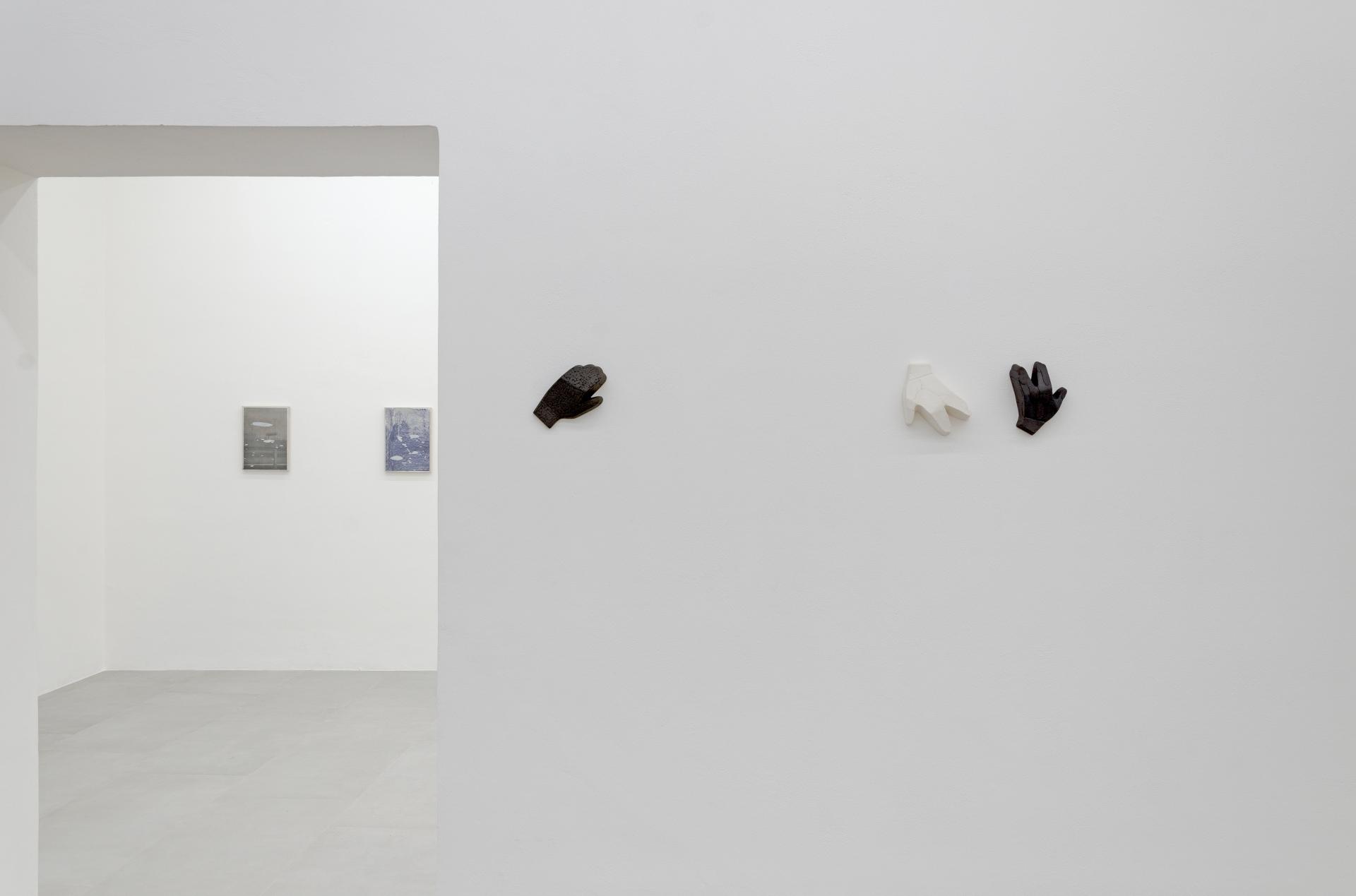 The small sculptures exhibited here are created by a process of transposition and "materialization" of a silhouette drawing, previously obtained by tracing the profile of a real hand on a cartboard; the first one was the left hand of the artist himself, and then of many others, among friends, colleagues and acquaintances. The cardboard, cut out and folded according to the drawn outline, is then filled with an excessive volume of material that not exactely takes into account the natural hand/model but, almost in opposition, it self-represents and self-exalts as autonomous Volume, rising to rank of "subject" itself. The classic process of calque or casting molds gives volume and texture to the finished shape, that now appears smooth and white, now corrugated and black.