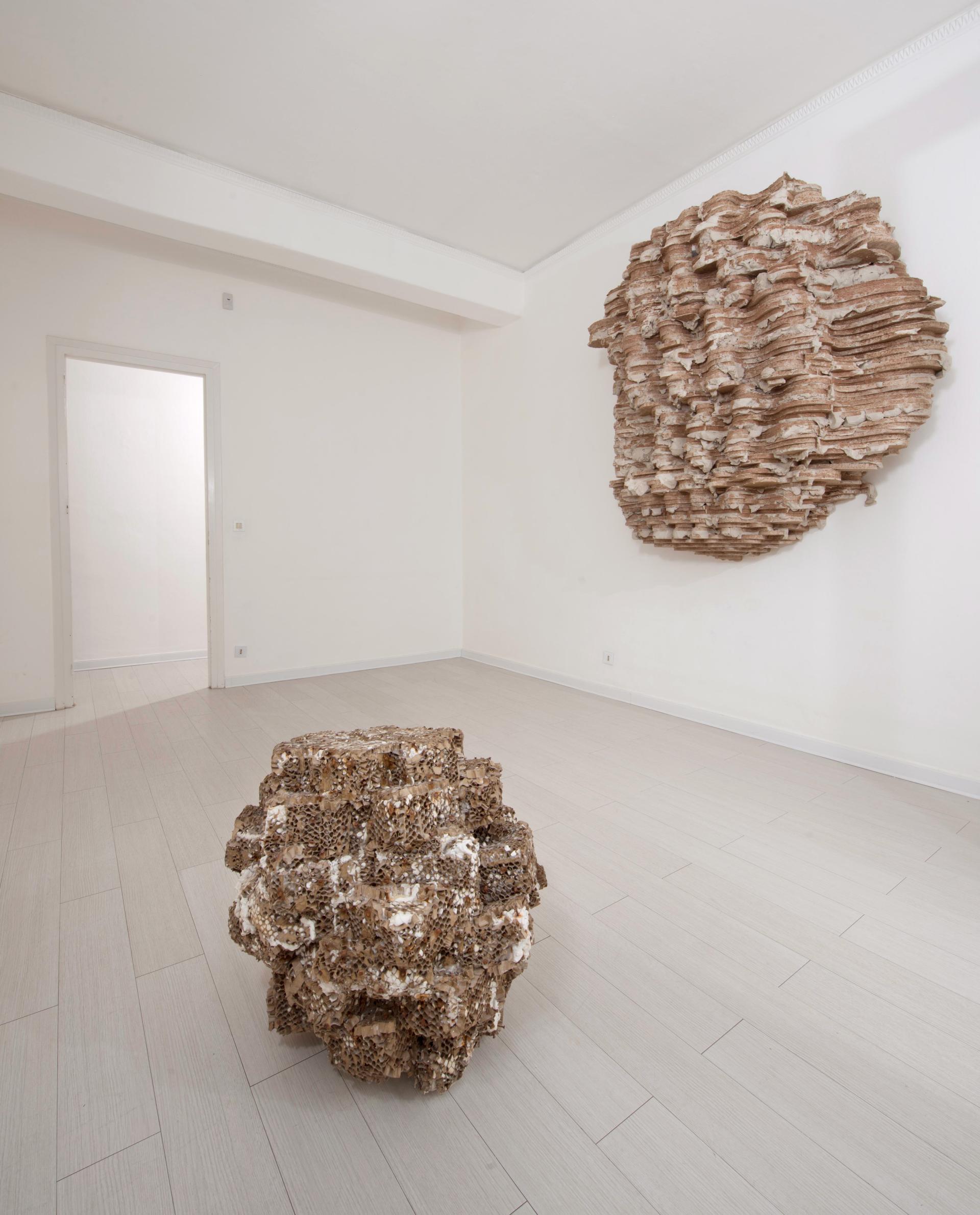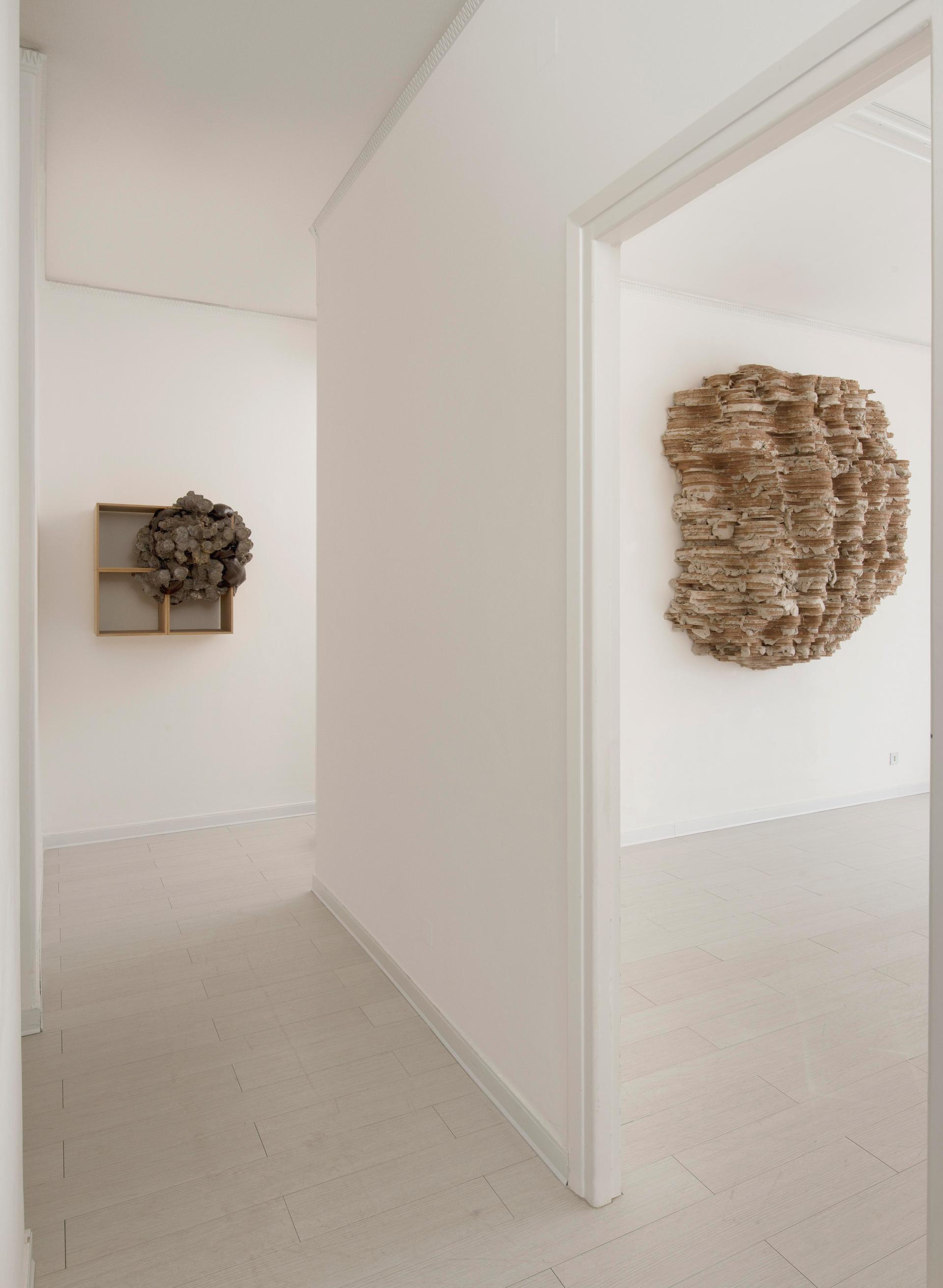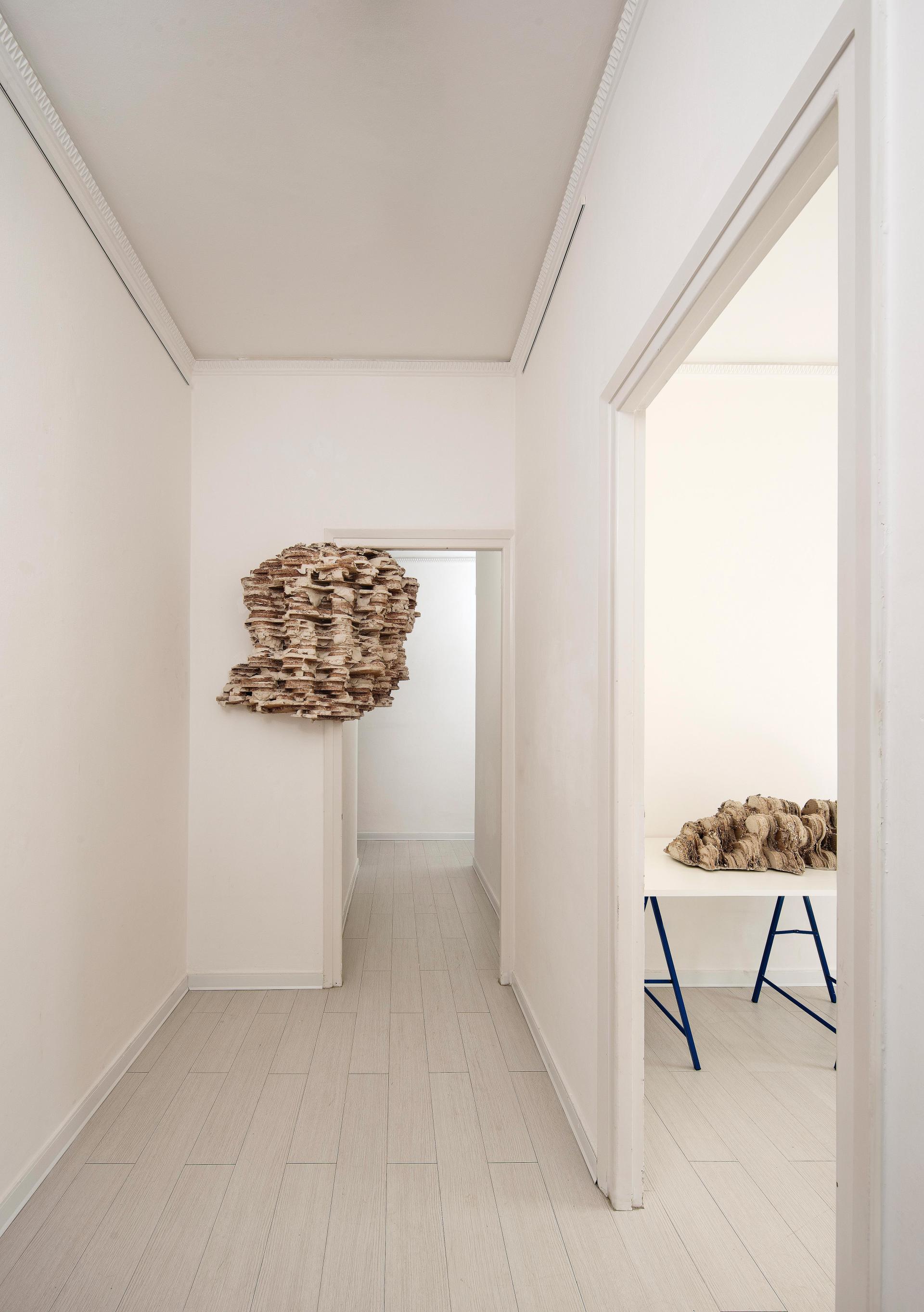 Fleig's sculptures develop as organic structures in a state of proliferation and growth, invading the space that houses them: support structures, pillars, walls, floors, windows, ceilings, become for the Artist potential points of anchorage of his installations, that, in some cases, are clinging to the outside of buildings of exhibition spaces and museums - as parasitic bodies or organogenic concretions - capable of interrupting, sometimes eerily, the normality of the known places, of the urban spaces safe and defined.