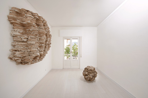 Made of cement, concrete, plaster, wood and polyurethane, the artworks of Fleig - although consisting of very similar materials to those of the hosting environments - appear lightweight and full of life; these common building materials, used in an unconventional way, result in amazing shapes that evoke a strong emotional response, and create a striking contrast with the architectural element, in a kind of confrontation and competition between lightweight and heavy, organic and inorganic, biomorphic and anthropic.
