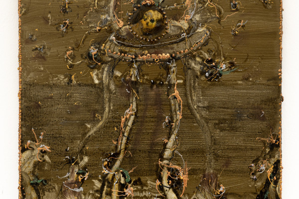 Access to abstractly dystopian scenarios is indicated through a vertigo-like perspective. Vertigo in the visual sense, or rather the bewilderment of the gaze in the multiplication of details on the surface, arranged in sprouting concretions, organic simulacra and old cybernetics on a collision course in the cosmos. Vertigo also in the demand for an imaginative trend, in hypothesizing the consequences and drifts of the anthropocentric landscape, renouncing stable coordinates and morphologies, buried under a halo of desolating fog, or encountering other panoramas that, by chromatic and iconographic choice, are its schizophrenic, psychedelic, hallucinated counterpart. The narrative of decadence is exacerbated by the material and precious use of color; thus, on the backgrounds of mists and swamps, new primitive idols already reassemble their own cults and lavish architecture with the wreckage of the past.