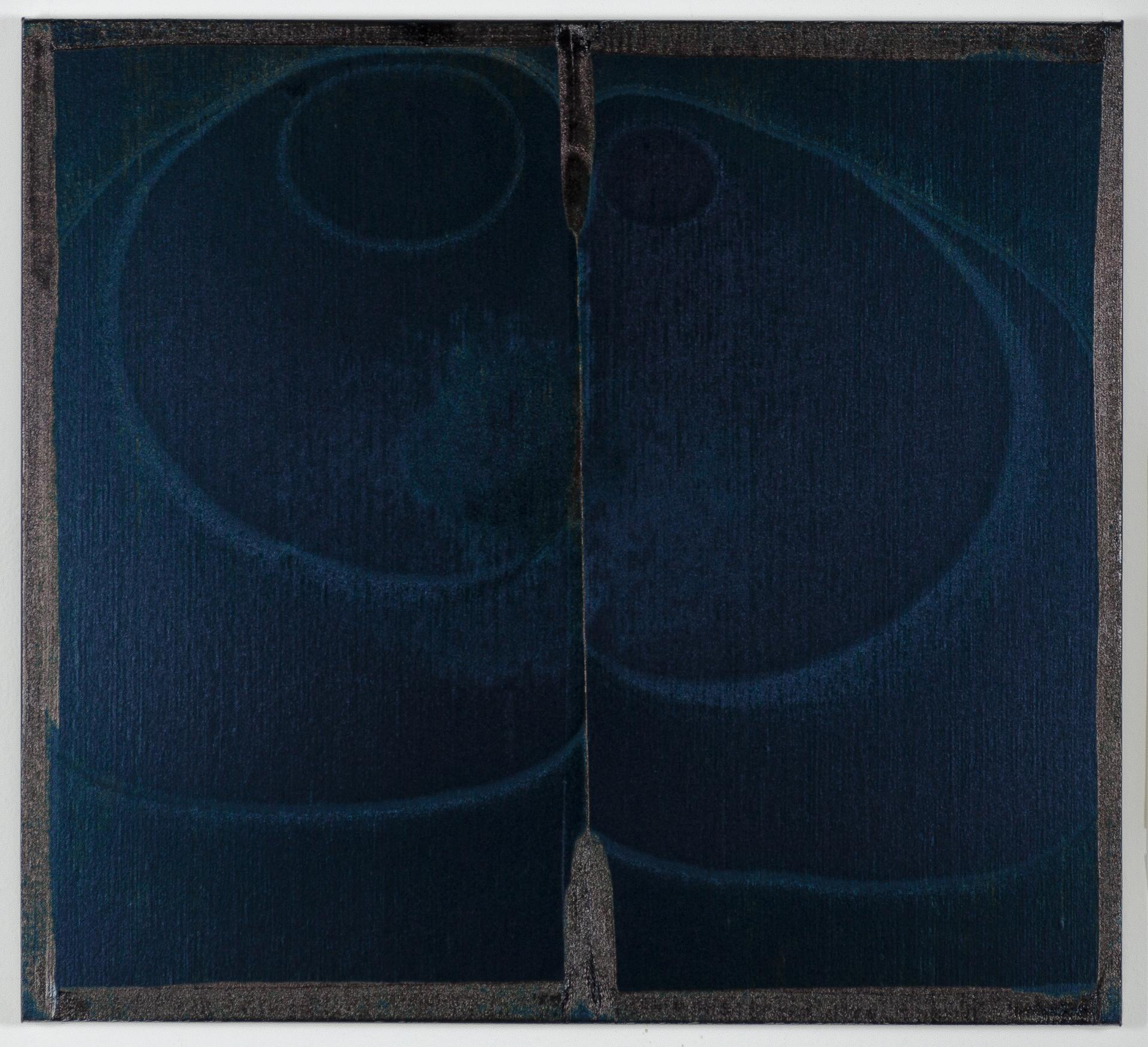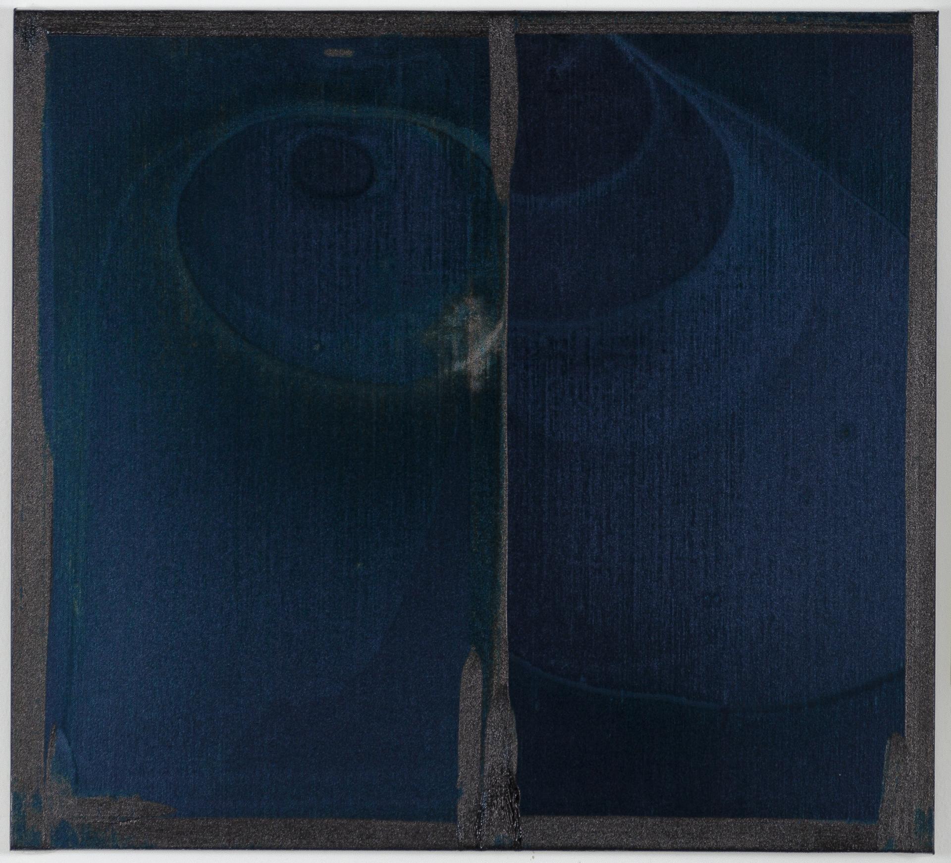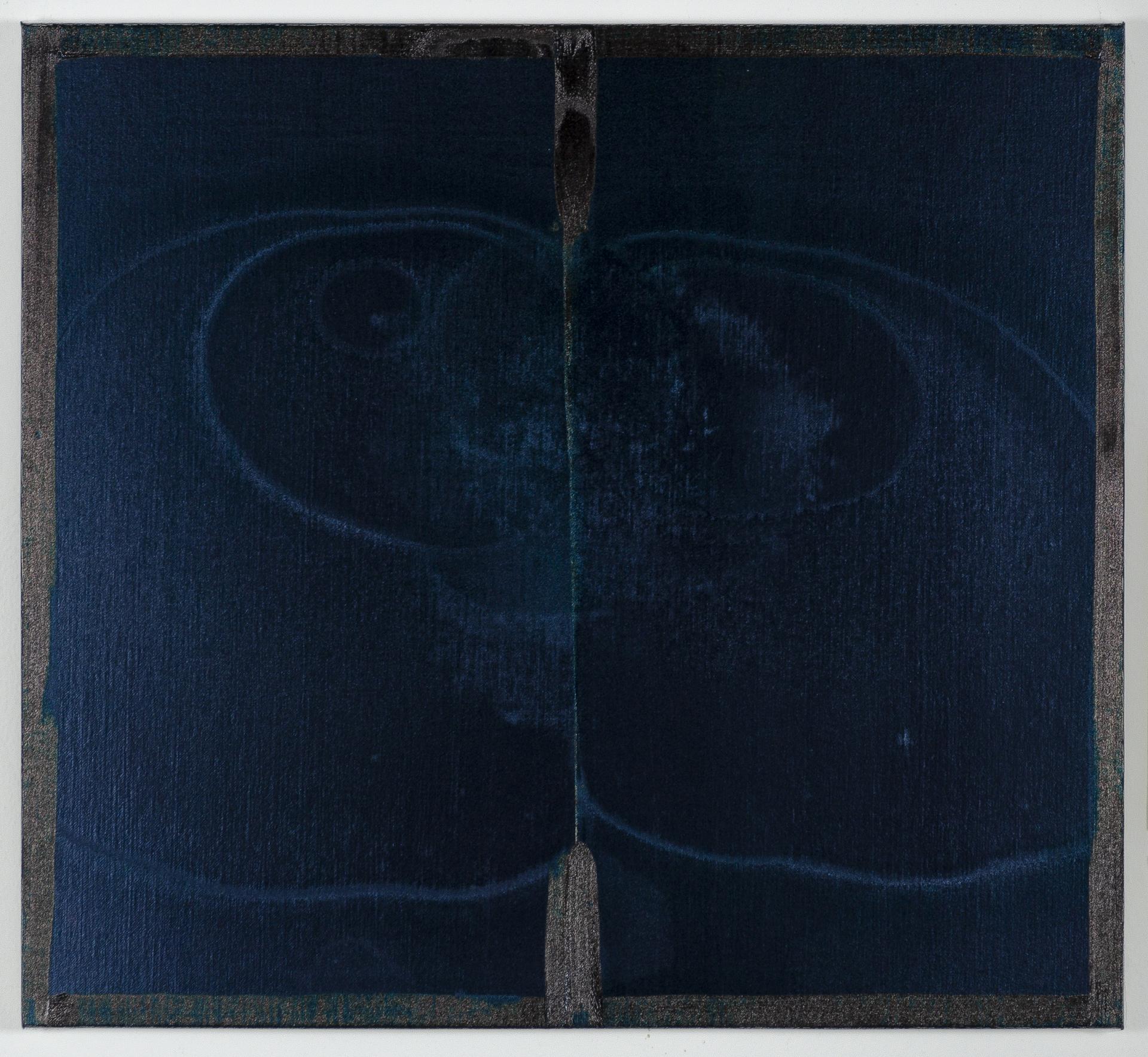 Prussian blue is a highly unstable pigment, destined for chromatic transformation and oxidisation. The chemical compound known as ferric ferrocyanide gives birth to an utterly distinctive blue, also known as Eisenblau (iron blue), which – when exposed to the action of sunlight and when in contact with canvases’ preparatory layers – deviates chromatically, assuming a mottled aspect and ultimately returning to its origins as a ferrous material, literally rusting. These artworks are born blue and, through an innate evolutionary process neither determined nor controlled by the artist, oxidise with time and partially ‘rust’, revealing a brownish-red colour in some or many areas of the painting. In the formal synthesis that animates these paintings, they establish and circumscribe themselves within the physical confinements, distilled and idealised, of the tableau format typical of European twentieth-century painting.
