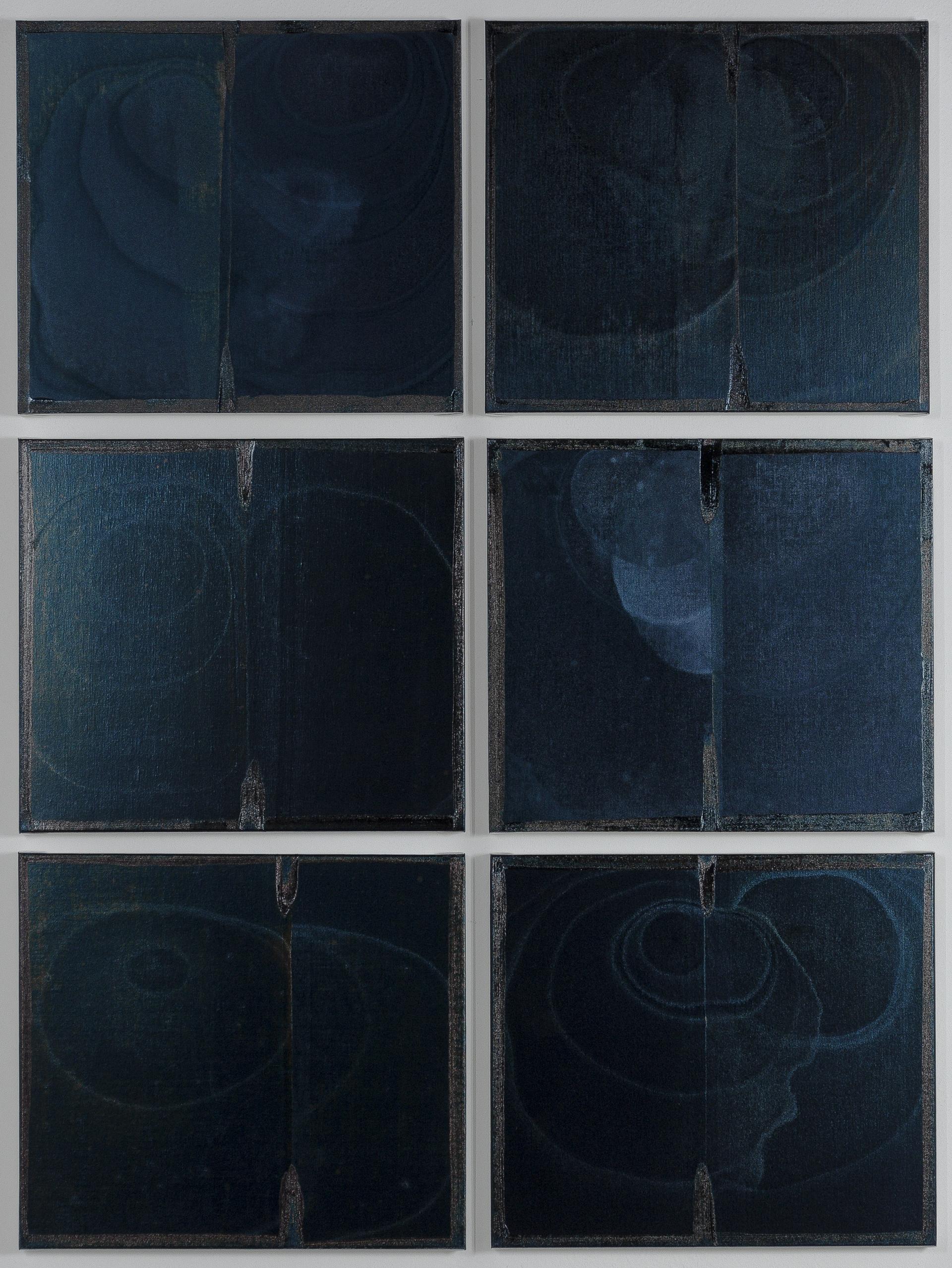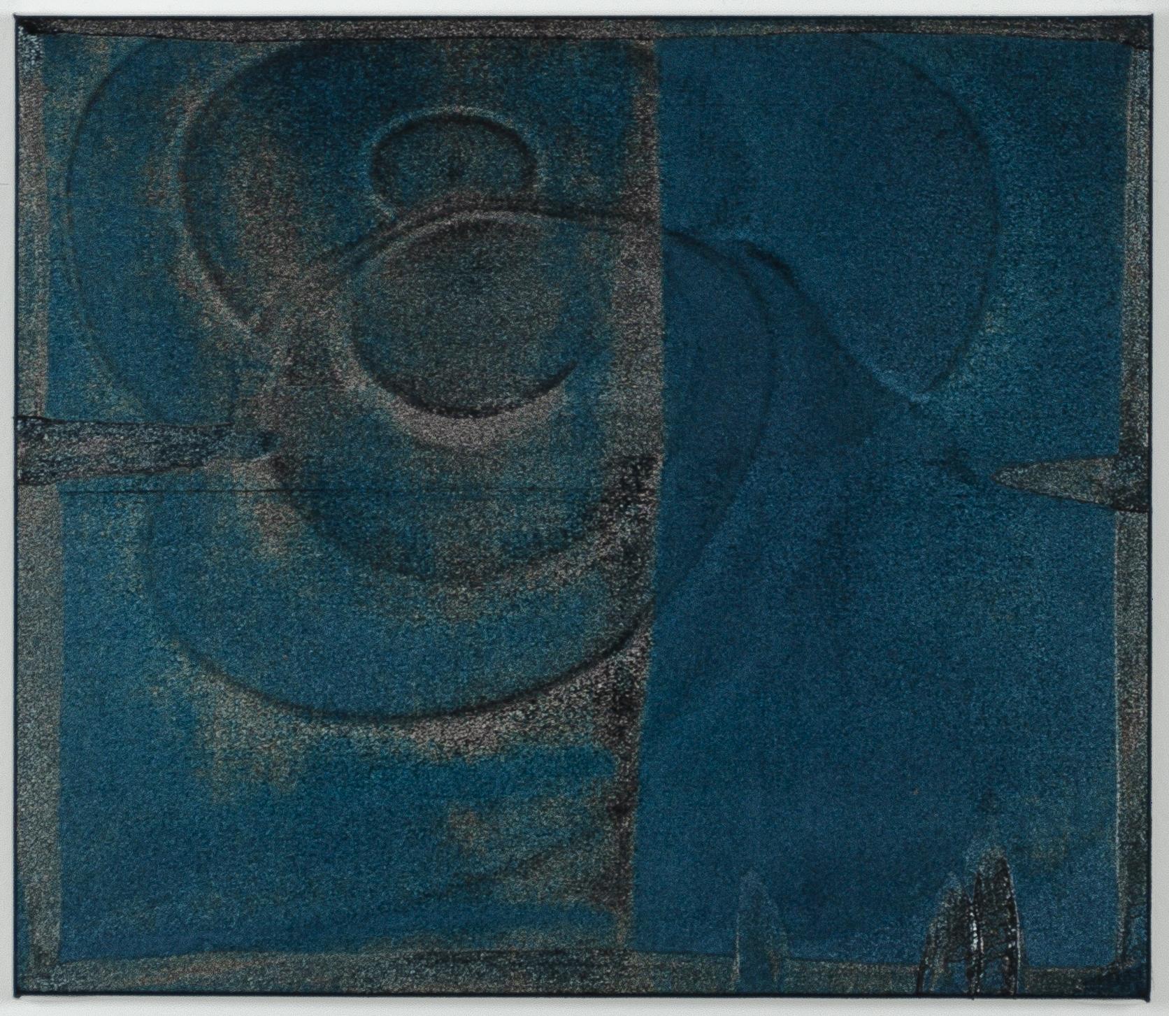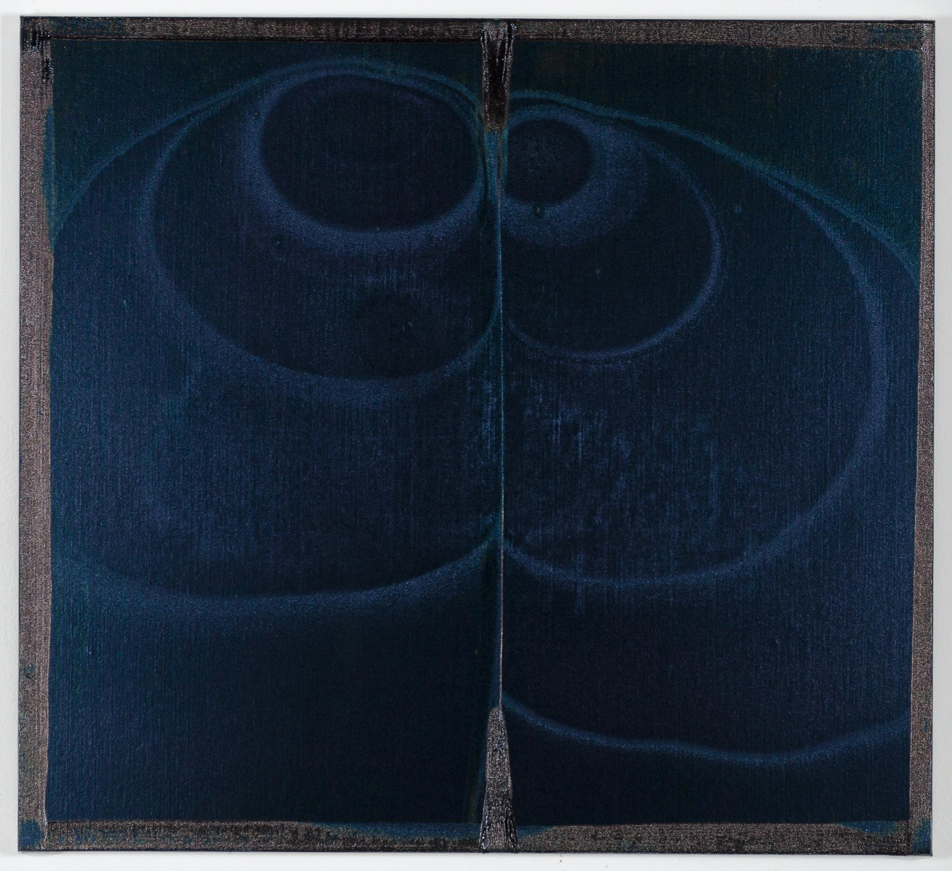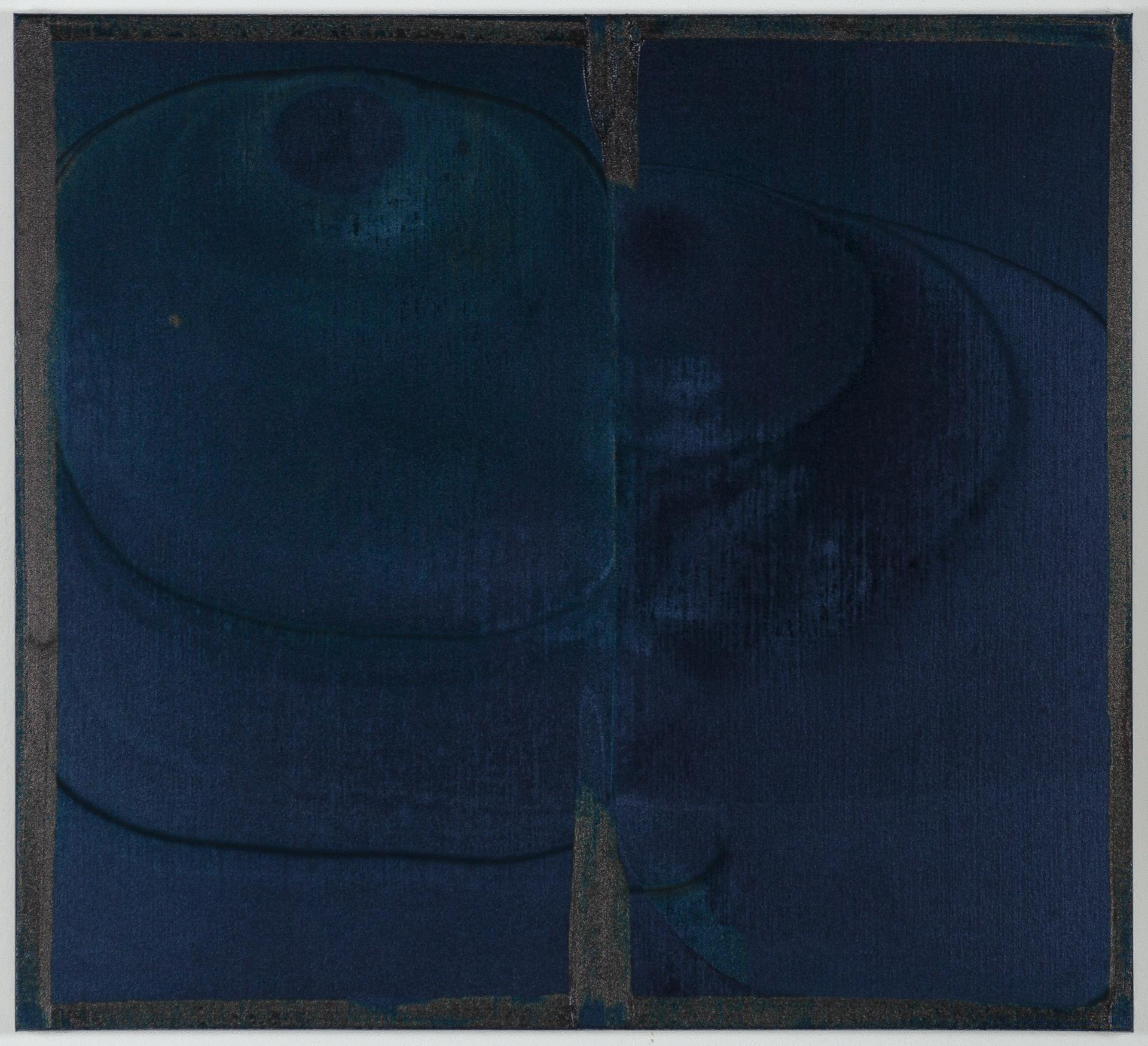 Prussian blue is a highly unstable pigment, destined for chromatic transformation and oxidisation. The chemical compound known as ferric ferrocyanide gives birth to an utterly distinctive blue, also known as Eisenblau (iron blue), which – when exposed to the action of sunlight and when in contact with canvases’ preparatory layers – deviates chromatically, assuming a mottled aspect and ultimately returning to its origins as a ferrous material, literally rusting. These artworks are born blue and, through an innate evolutionary process neither determined nor controlled by the artist, oxidise with time and partially ‘rust’, revealing a brownish-red colour in some or many areas of the painting. In the formal synthesis that animates these paintings, they establish and circumscribe themselves within the physical confinements, distilled and idealised, of the tableau format typical of European twentieth-century painting.