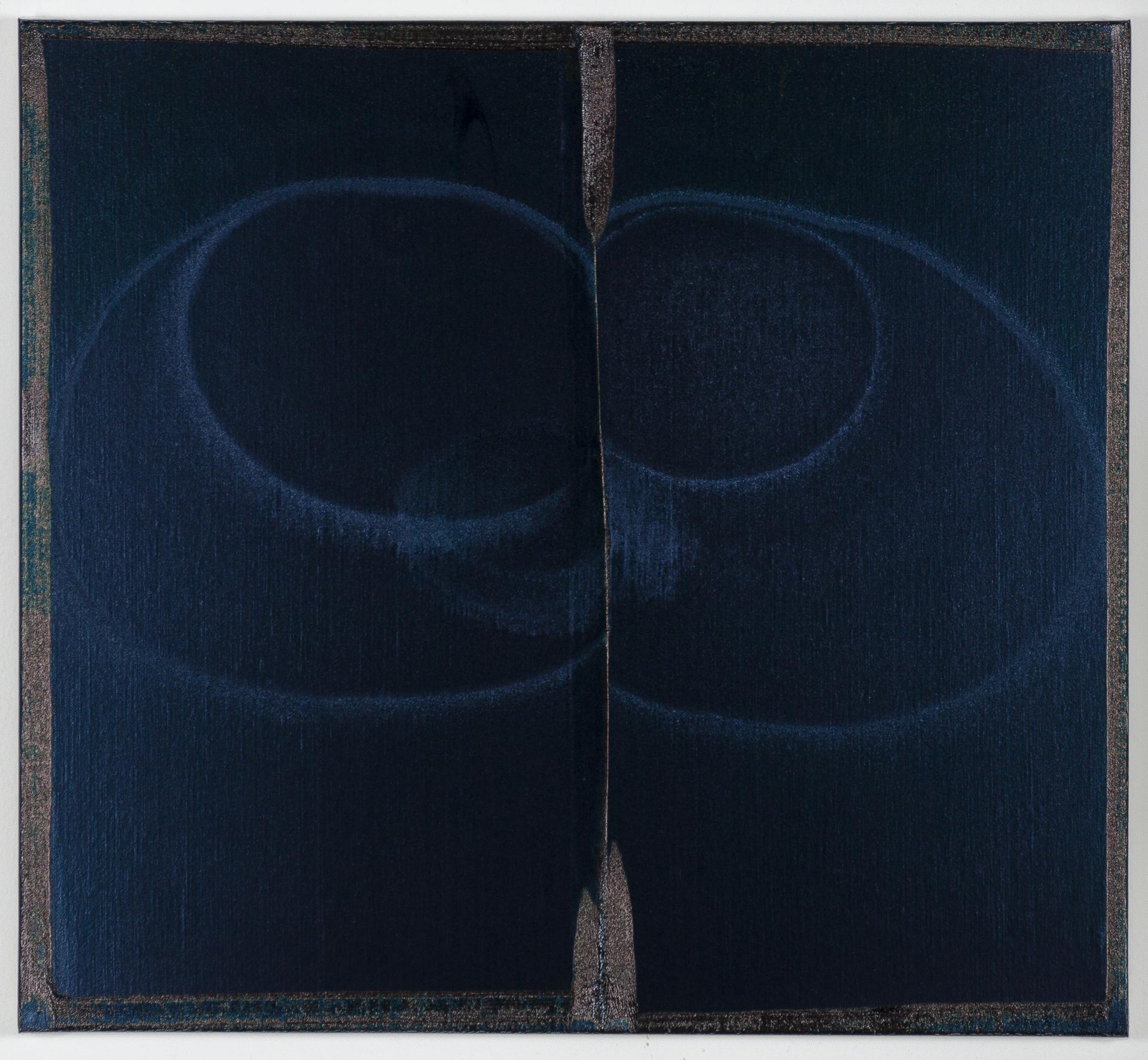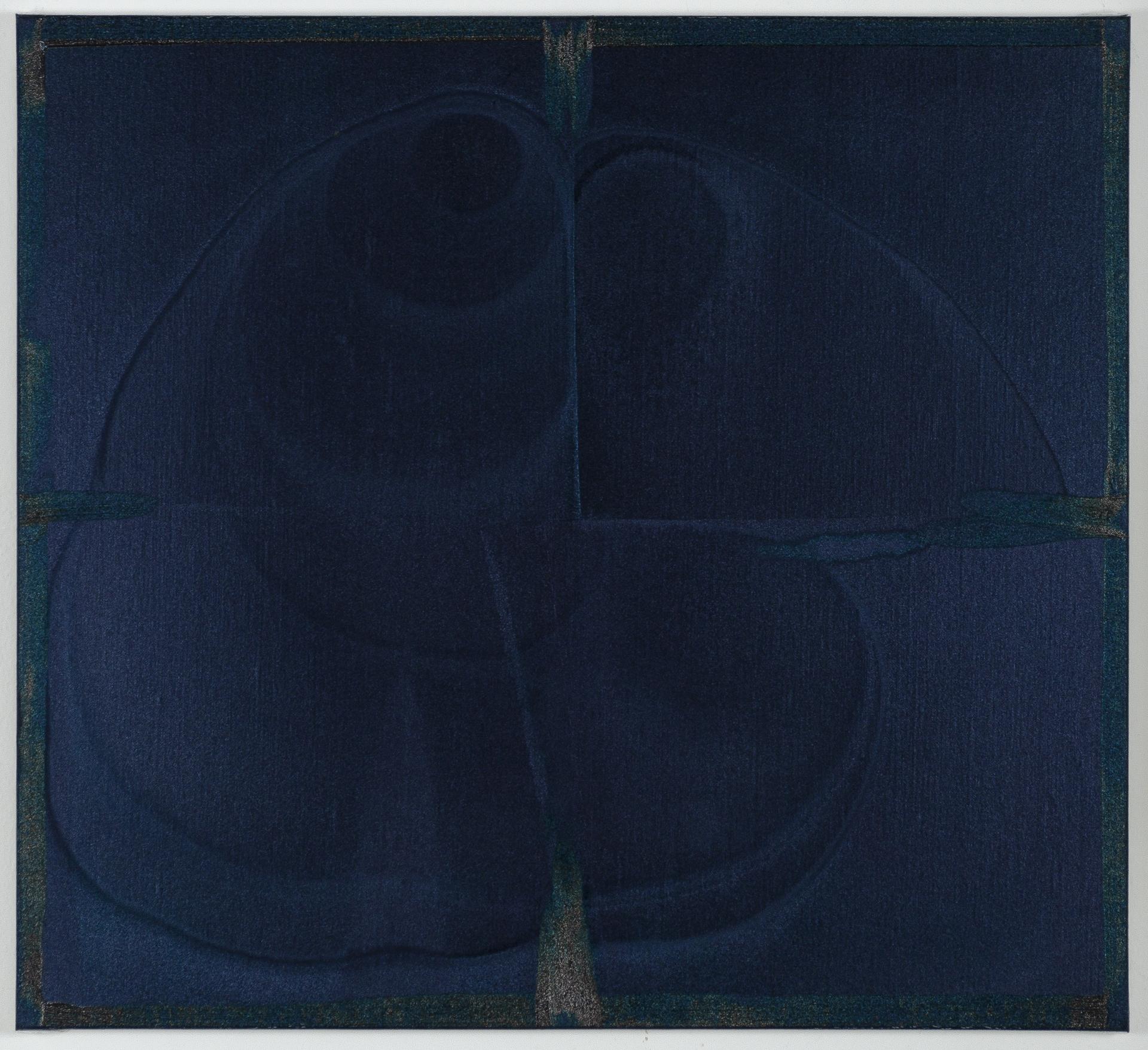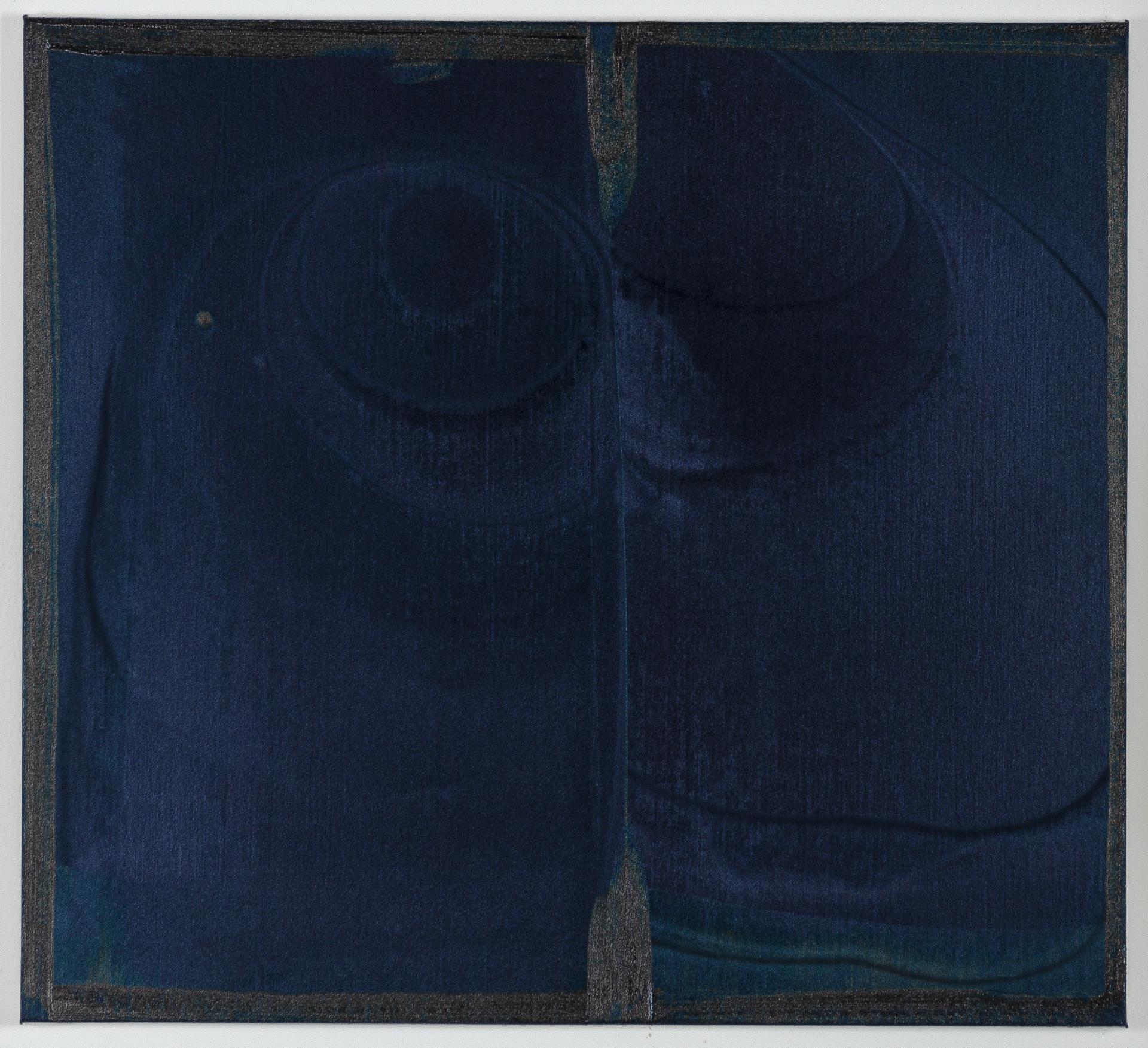 … In the paintings entitled „Abwesenheiten in Preuβisch Blau” (Absences in Prussian Blue), blue is the only colour used to execute the painting, through the adoption of a mechanical process that determines the silken fineness and density of the pictorial substance. Through the use of a screenprint frame, employed merely as a filter, the oil paint passes onto the canvas, where the contact between the serigraphic fabric and the pigment defines the latter’s texture and at the same time generates the image that autonomously reveals itself in the centre of the painting. Through pressure upon the screenprint frame and then its release, it is the paint itself to expand or to reach outward, displaying the relative tension of the picture plane in its entirety. Being painted horizontally and level further instils and embeds an ontological profundity into the works’ subjects, rather than an illusory perspective, so that the contents are structured upon their enclosure within the two-dimensional plane. The pictorial surface is finally marked along its entire perimeter by the application of thumb pressure through the screenprint frame into the still-wet paint, in a tautological demarcation of the physical extent of the painting. Signs of this action are visible as a negative image, in the form of tracks, along the margins: thereby forming the single voluntary gesture on the part of the artist throughout the absolute self-creation of the image.