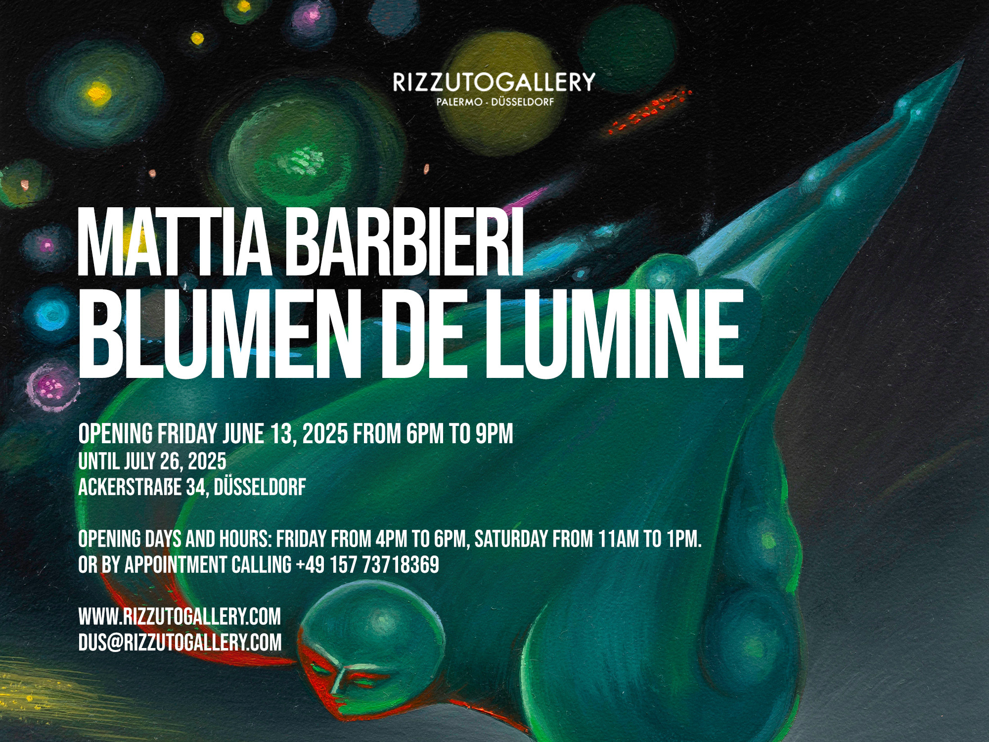 BLUMEN DE LUMINE - new solo exhibition by the artist Mattia Barbieri (Brescia, 1985. Lives and works in Milan), which will be inaugurated on Friday, June 13, 2025, from 6:00 PM to 9:00 PM, at the gallery’s venue in Düsseldorf, Ackerstraße 34.