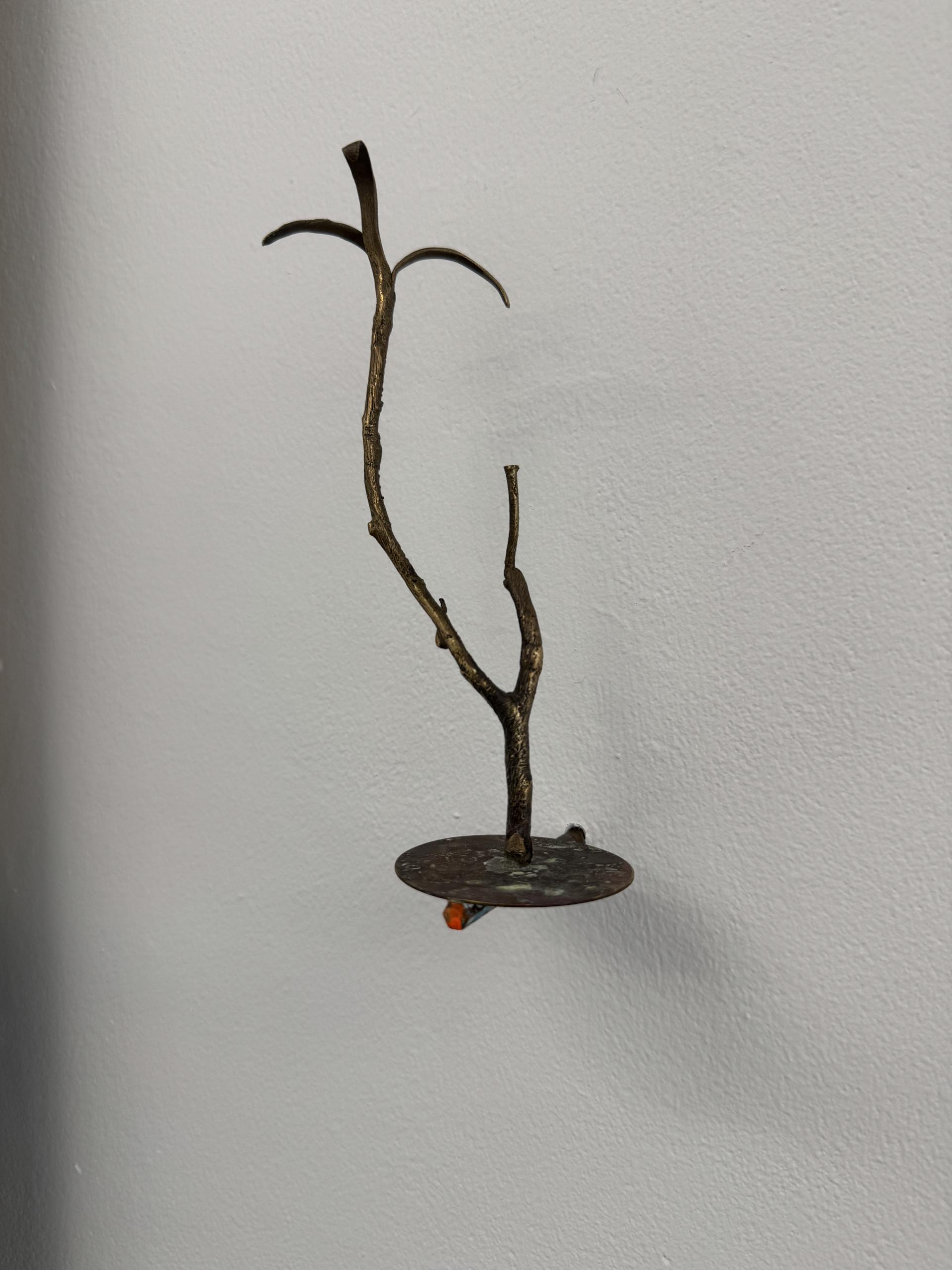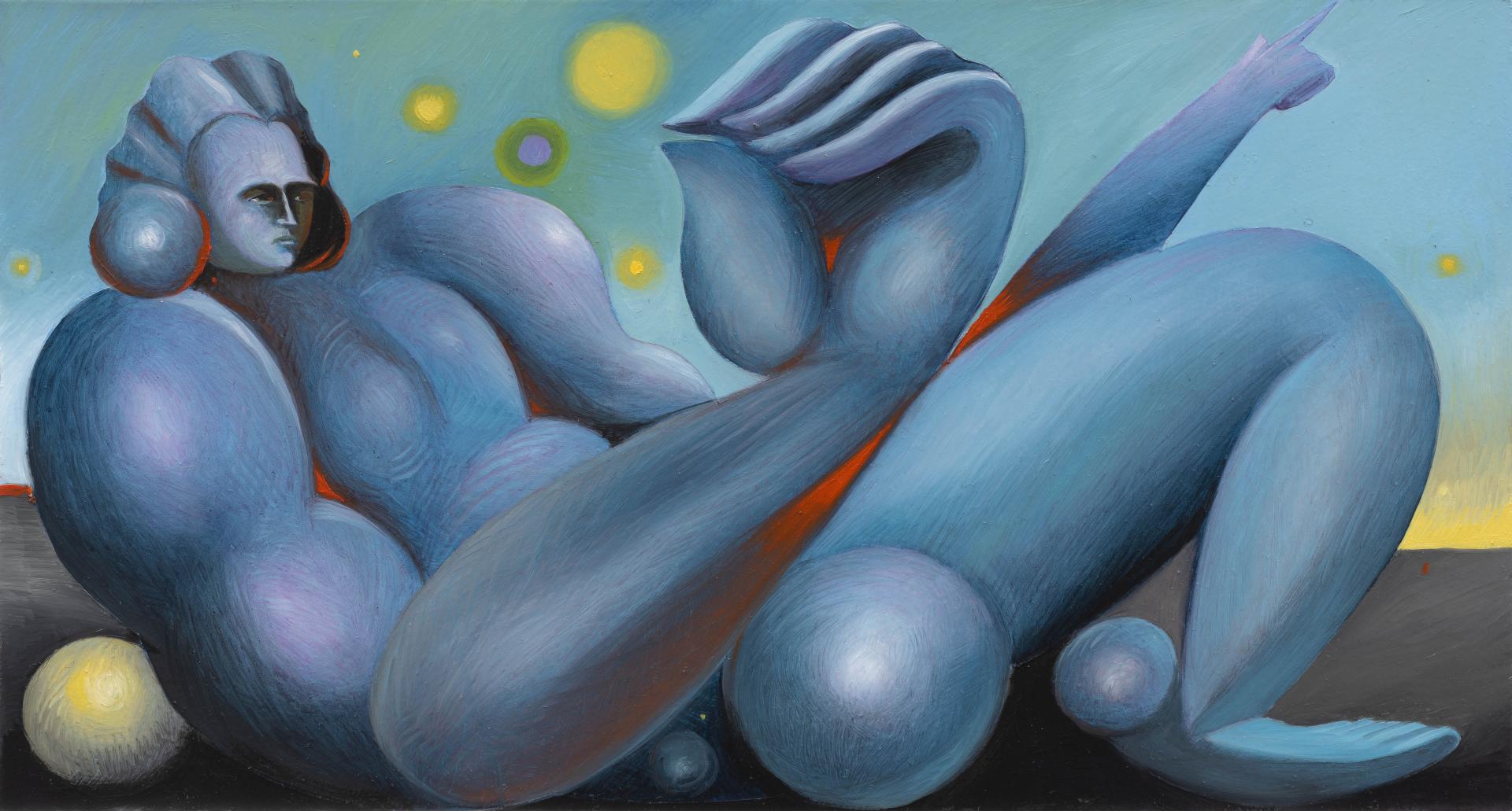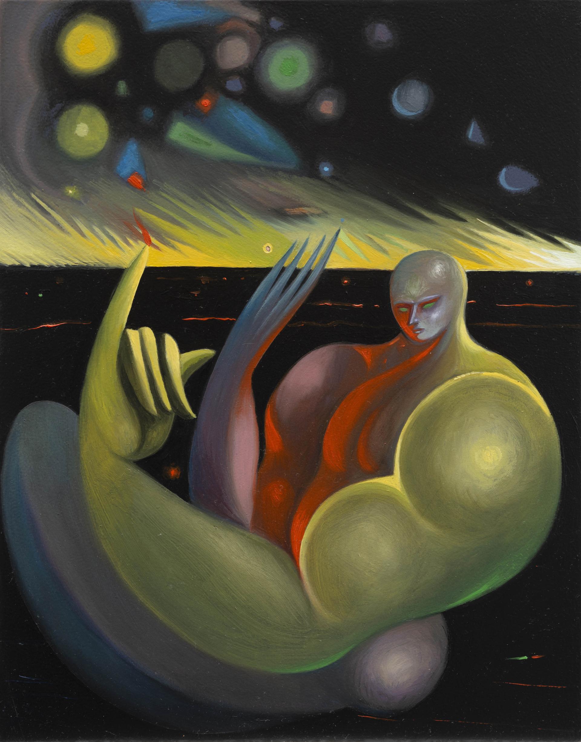 In BLUMEN DE LUMINE, human figures – massive and powerful – appear like divine giants, oscillating between heaven and earth. Spatial dimension and circular movement are recurring dynamics that expand visual perception, as if each painting were a nucleus from which new energy radiates. In this context, the copper support plays a crucial role: beyond serving as a conductor, copper becomes a magical surface, a channel through which the emanations of the subjects flow toward the viewer, endowing the painted forms with power.