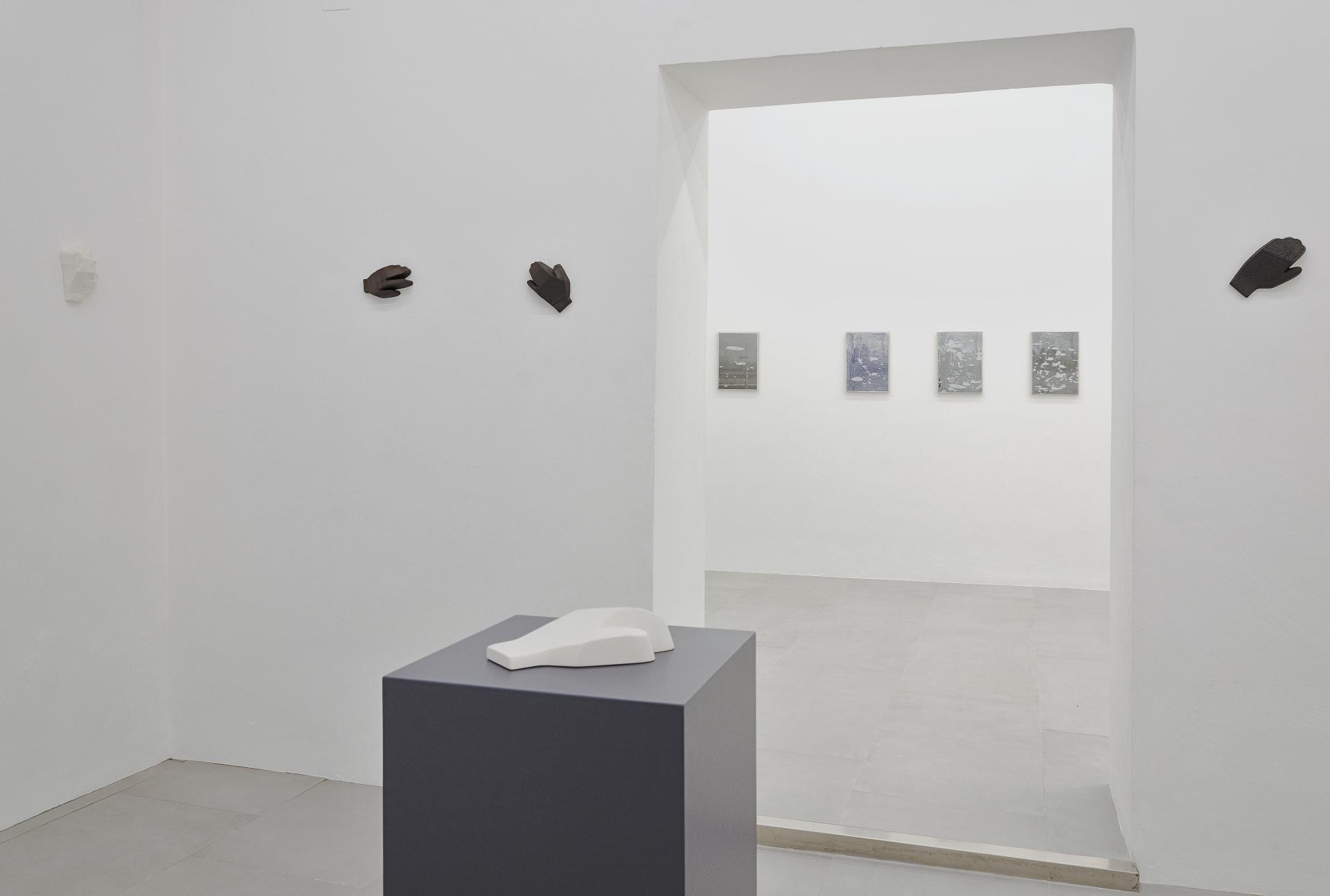 The small sculptures exhibited here are created by a process of transposition and "materialization" of a silhouette drawing, previously obtained by tracing the profile of a real hand on a cartboard; the first one was the left hand of the artist himself, and then of many others, among friends, colleagues and acquaintances. The cardboard, cut out and folded according to the drawn outline, is then filled with an excessive volume of material that not exactely takes into account the natural hand/model but, almost in opposition, it self-represents and self-exalts as autonomous Volume, rising to rank of "subject" itself. The classic process of calque or casting molds gives volume and texture to the finished shape, that now appears smooth and white, now corrugated and black.