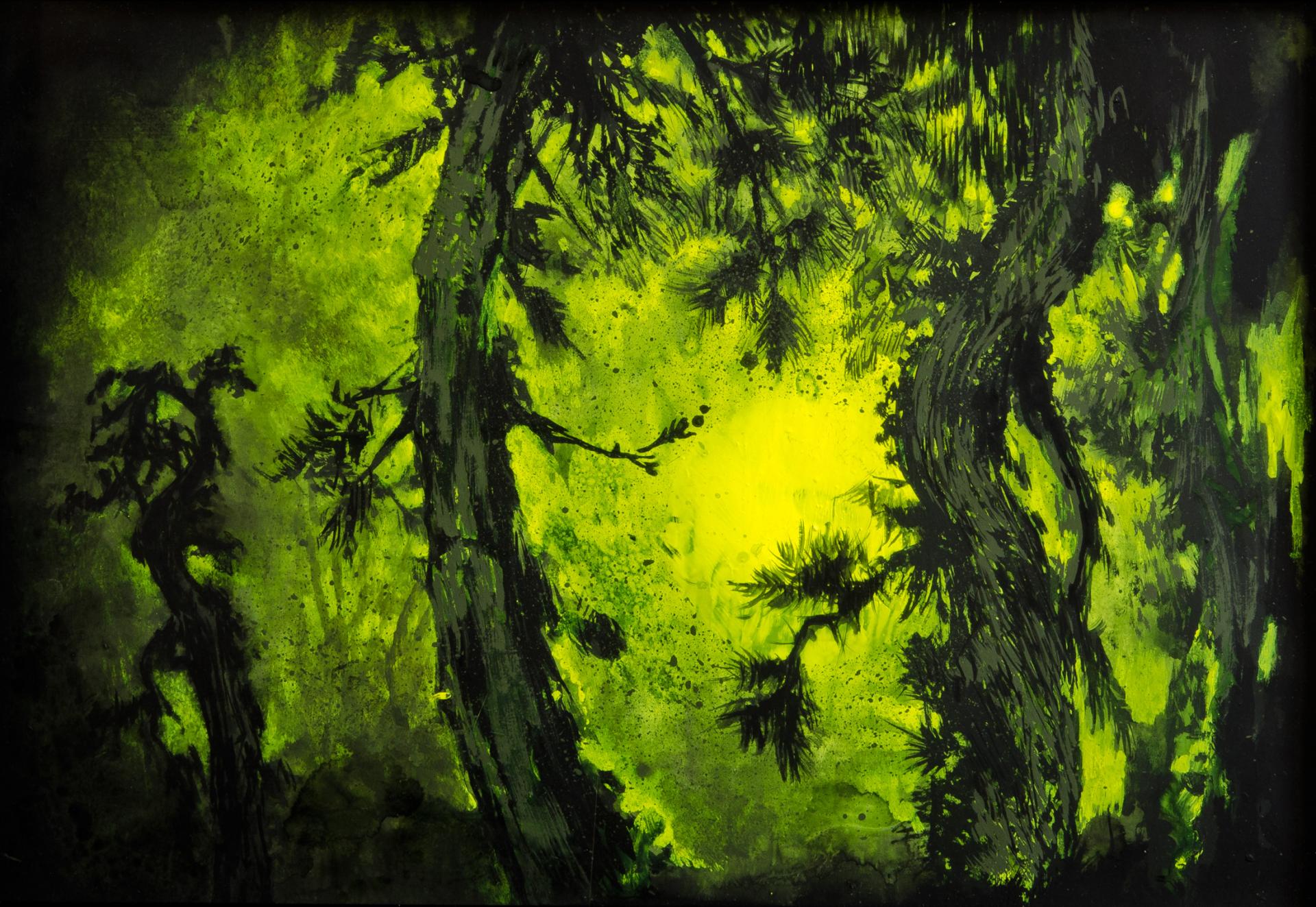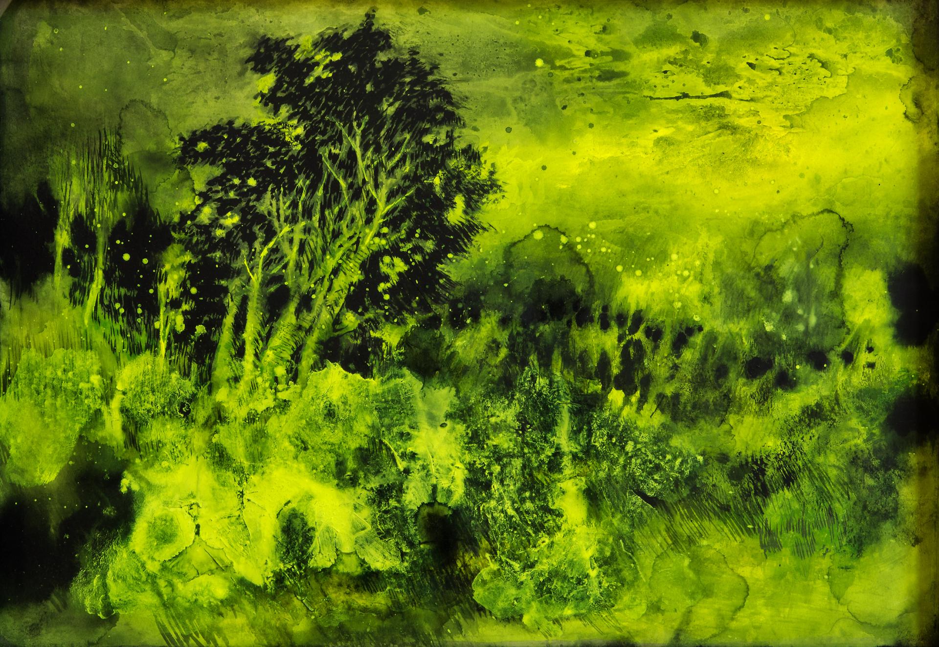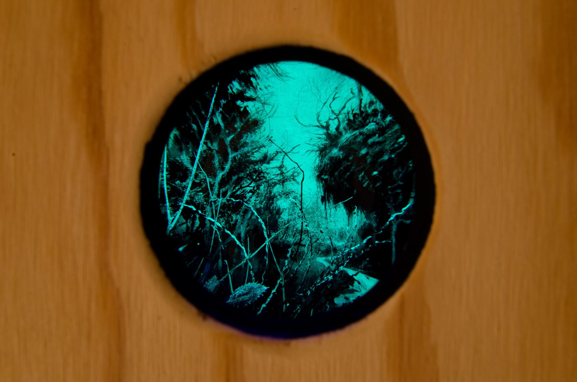 With his painting, Francesco De Grandi (Palermo, 1968) creates an intense emotive relationship of internalization and projection with the original state of realness by generating landscapes, natures, places. Their appearing traditional landscape paintings have disorienting visionary qualities that untune the viewer by bringing him to an interior voyage with psychological and existential effects. For INTERIUER, the Palermitan artist presents WOOD #5 NUOVO MONDO (Zograscope), a new project designed for gallery spaces that reinterprets the landscape through an interplay of reduction and projection. WOOD #5 NUOVO MONDO continues the artist’s series WOOD realized by the use of fluorescent colors and illuminated by Wood lamps.